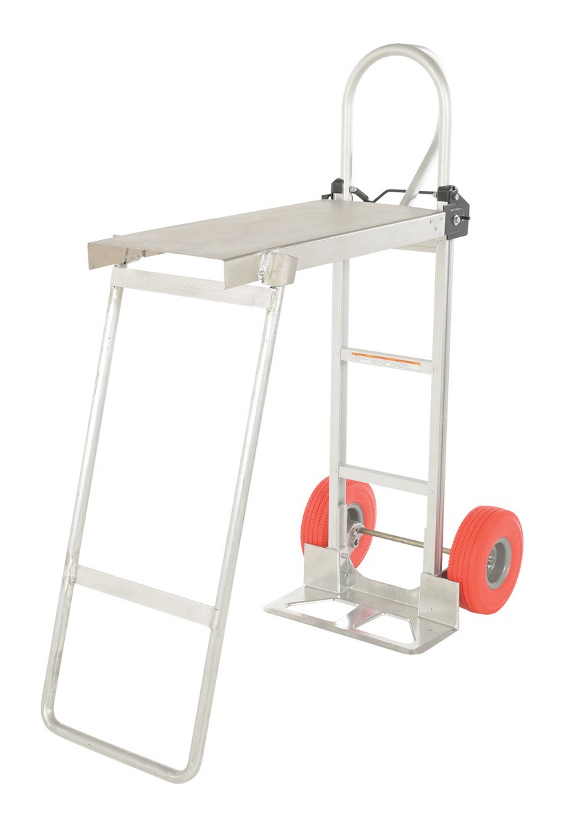 This lightweight aluminum hand truck features an integral work bench. Work bench conveniently folds flat for storage. Now a sturdy work bench can be moved to where it is needed most. Provides for a more comfortable and ergonomically correct work position. P-handle design allows for easy maneuverability.