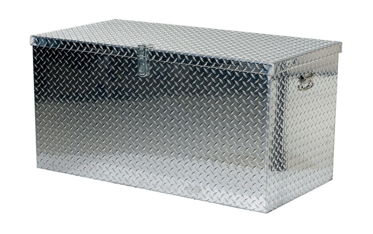 Secure your tools and other belongings from theft with this Aluminum Tread Plate portable tool box. There is a safety double hinged hasp for padlock securing with padlock not included. Constructed of diamond tread plate material. Features two (2) sturdy handles for transporting.