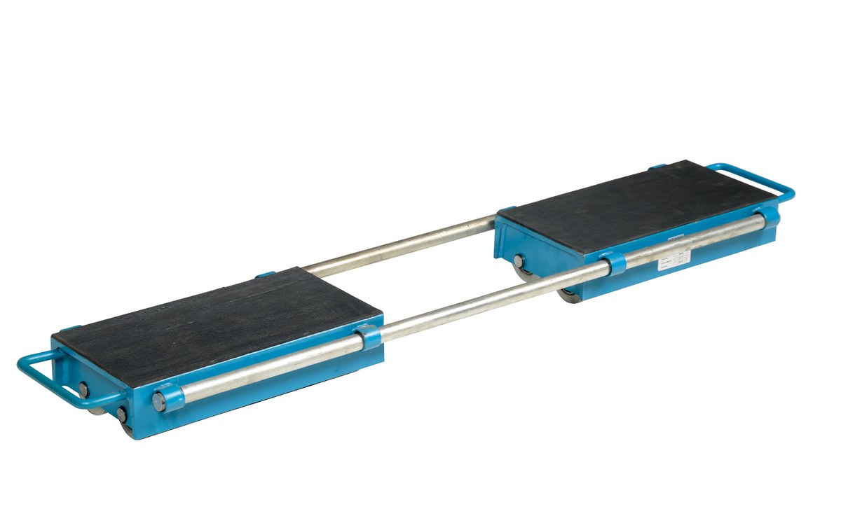 These machinery skates are designed to move heavy equipment and machinery. Steel wheels ideal for moving heavy duty equipment. The top of each skate includes a rubber surface for extra grip. Steel construction with handle to carry and position. The adjustable skate includes two (2) dollies connected with a two (2) slider bars to form one larger dolly. Slider bar allows for adjustable overall dolly width. Designed primarily for moving in straight lines.