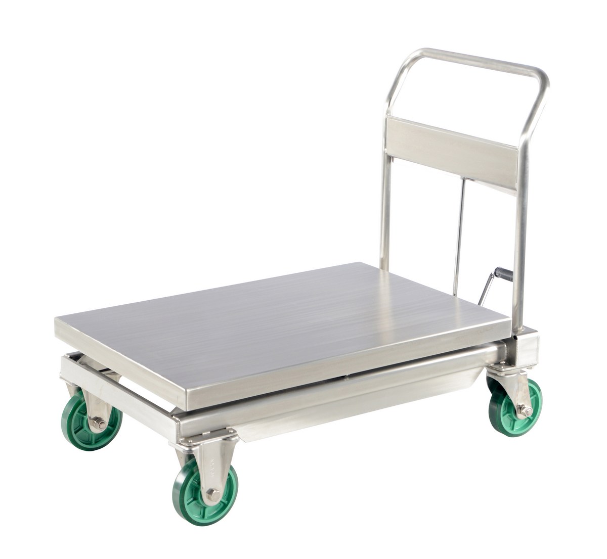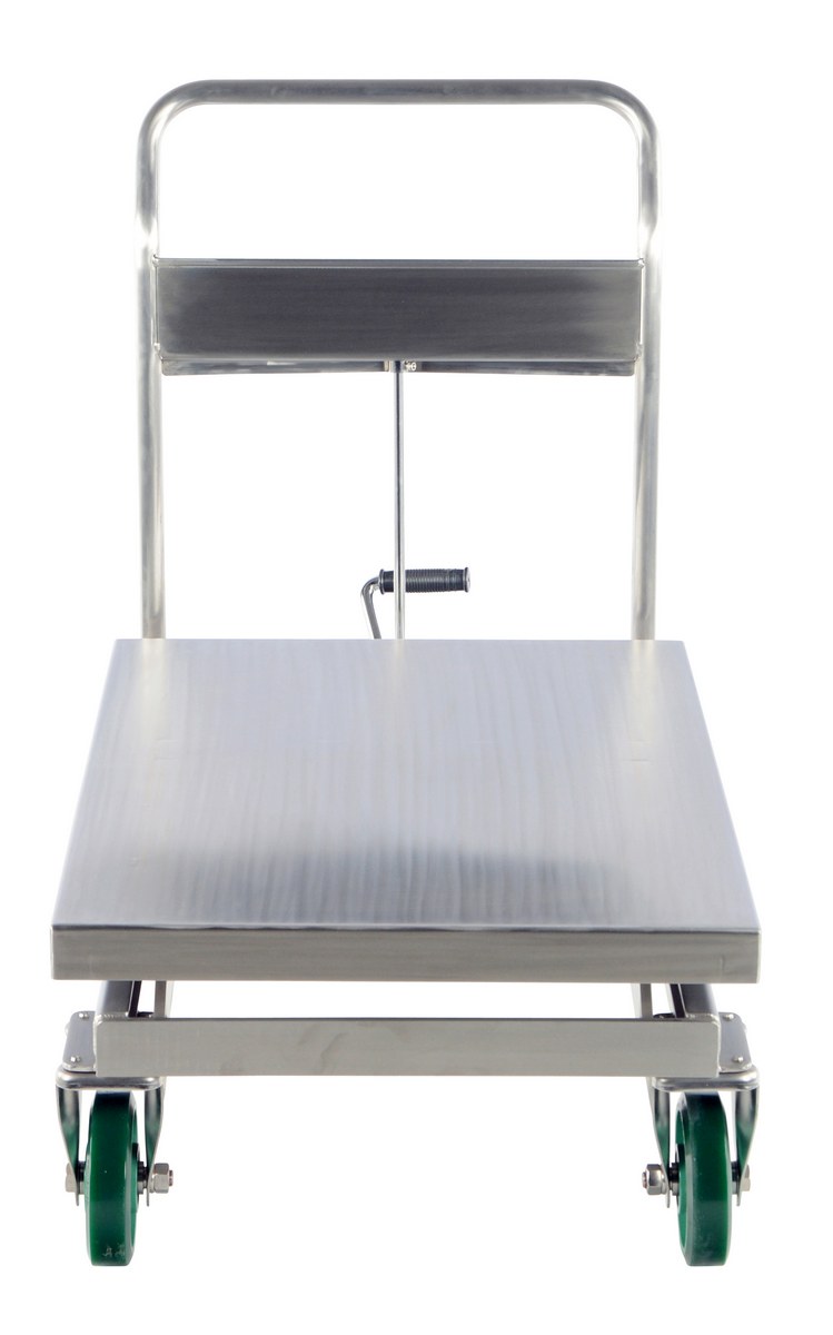 The Hydraulic elevating cart minimizes worker bending and lifting through its ergonomic design and portability. Material can be easily loaded onto a cart from a table, lowered to a safe transporting height, and raised to unload at destination. The foot pump includes a soft-lowering down valve. The unit moves easily on four polyurethane casters; two swivel with brakes and two rigid. Features a two-speed foot pump. Foot pump pedal, pump assembly and hydraulic cylinder are chrome plated. Rest of the unit is fully stainless construction. Features an internal safety velocity fuse in each cylinder.