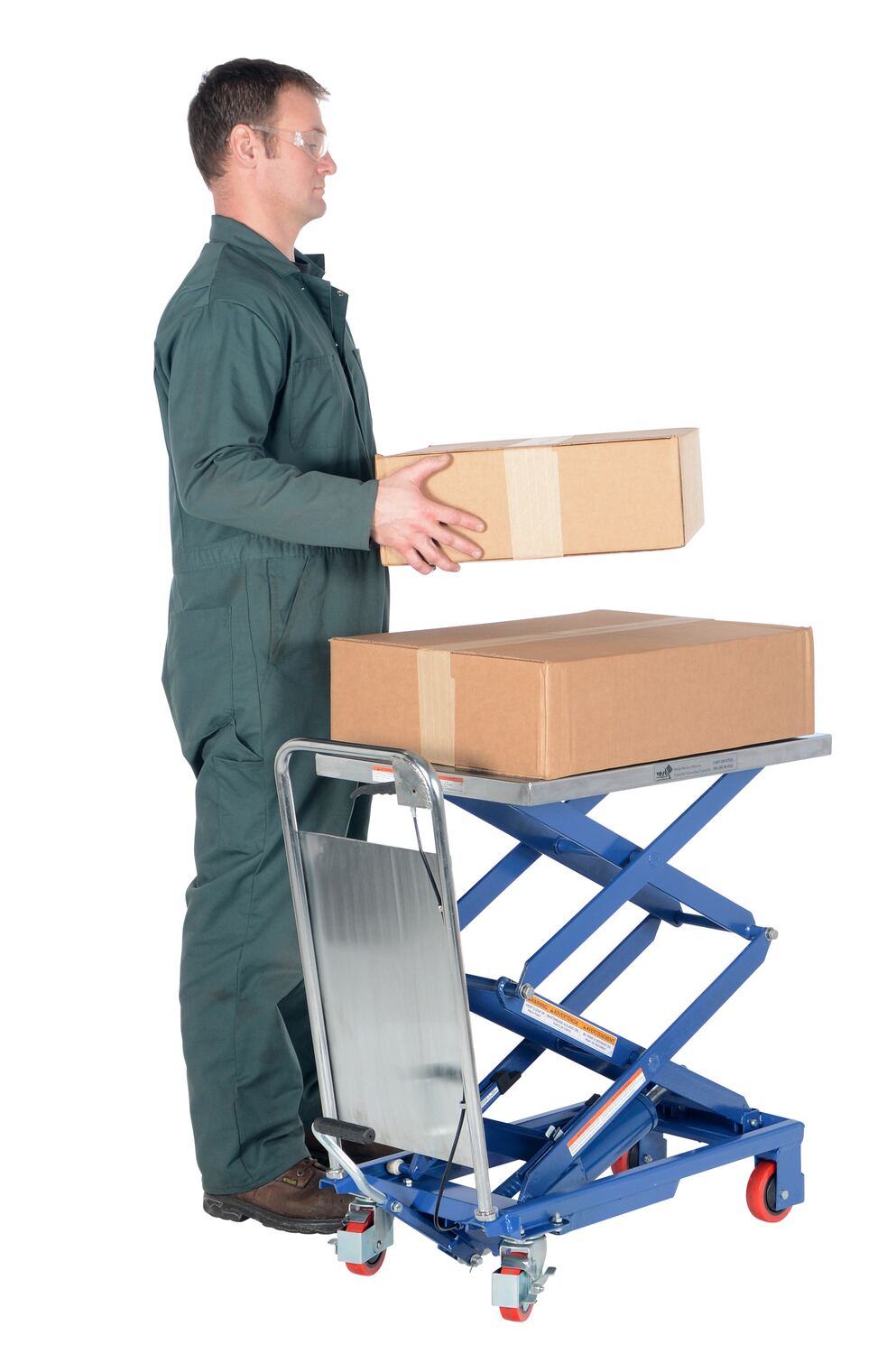 The Hydraulic elevating cart minimizes worker bending and lifting through its ergonomic design and portability. Material can be easily loaded onto a cart from a table, lowered to a safe transporting height, and raised to unload at destination. The foot pump includes a soft-lowering down valve. The unit moves easily on four polyurethane casters; two swivel with brakes and two rigid. Features a single-speed foot pump. Features an internal safety velocity fuse in each cylinder.