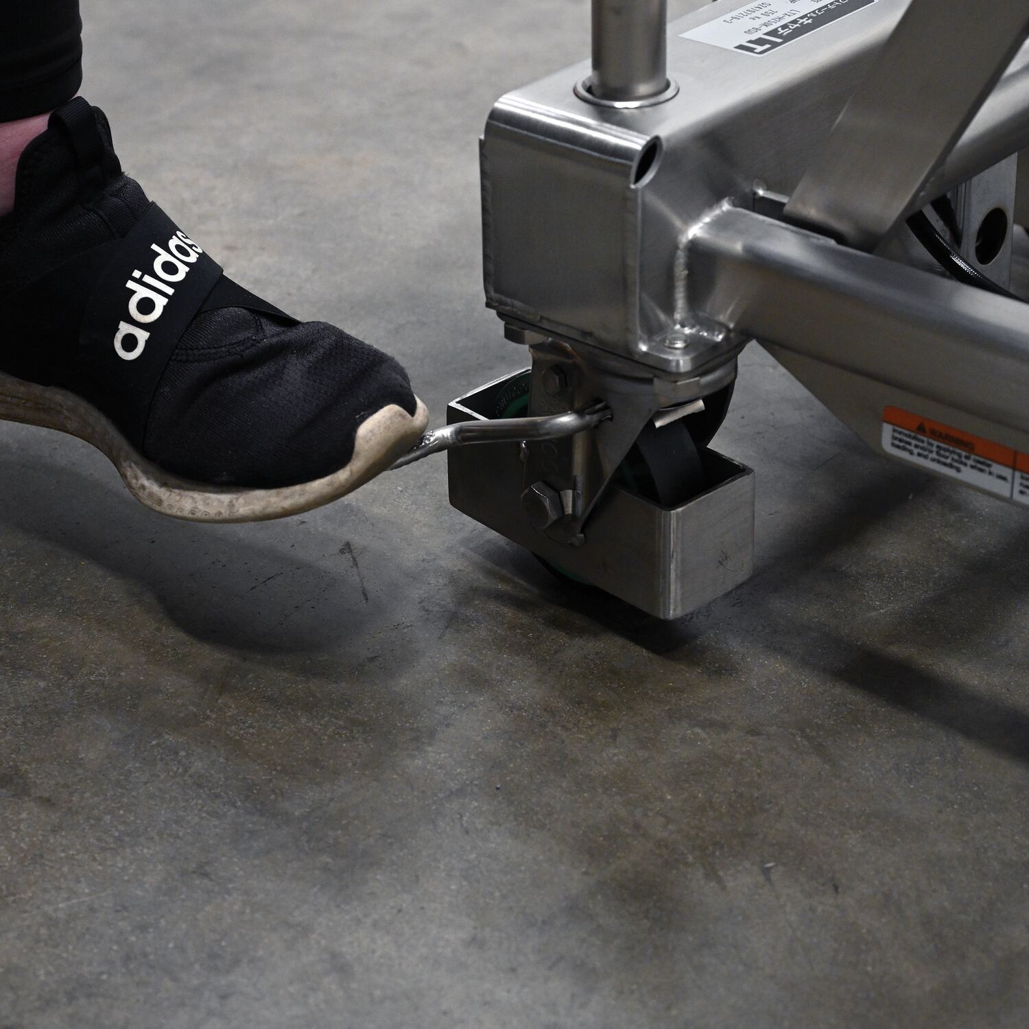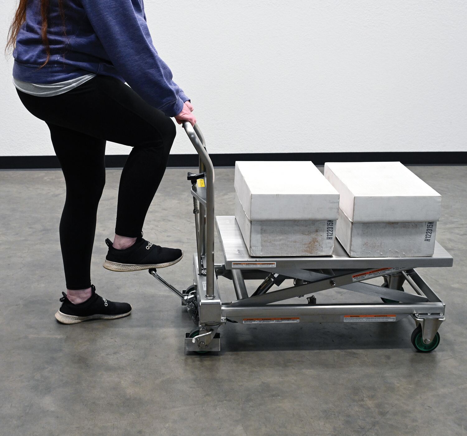 Stainless Steel Hydraulic Cart 19-1/2 In. x 31-1/2 In. 550 Lb. Capacity SilverThe Hydraulic elevating cart minimizes worker bending and lifting through its ergonomic design and portability. Material can be easily loaded onto a cart from a table, lowered to a safe transporting height, and raised to unload at destination. The foot pump includes a soft-lowering down valve. The unit moves easily on four polyurethane casters; two swivel with brakes and two rigid. Features a two-speed foot pump. Foot pump pedal, pump assembly and hydraulic cylinder are chrome plated. Rest of the unit is fully stainless construction. Features an internal safety velocity fuse in each cylinder.