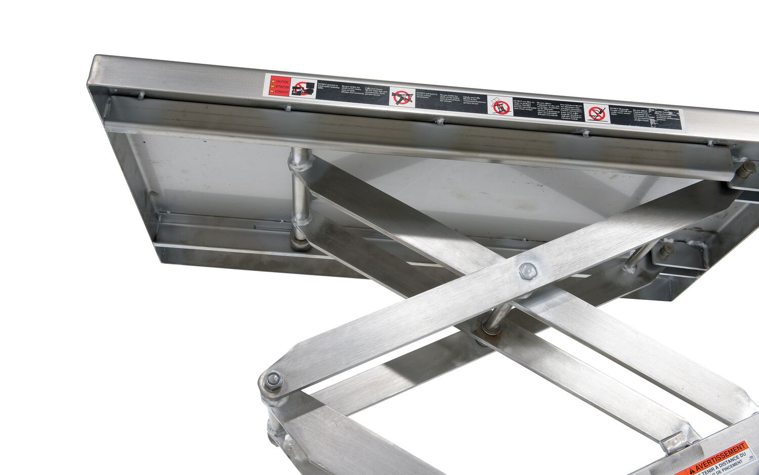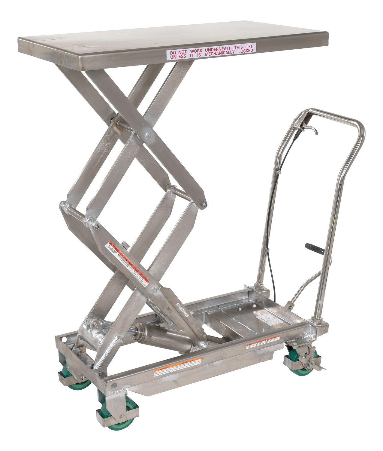 304 Stainless Steel Double Scissor Cart 36-1/4 In. x 19-3/8 In. 600 Lb. Capacity SilverThe premium scissor lift cart is constructed of heavy duty steel and designed to withstand the most demanding industrial environments. The simplicity and compactness of these products make them ideal for lifting and transporting loads, order-picking, die handling, and for use in support of assembly operations. There is little exertion required to maneuver the deck due to the high quality foot-actuated, single speed hydraulic pump for raising . A unique tilt-up table top allows for safe and easy maintenance.