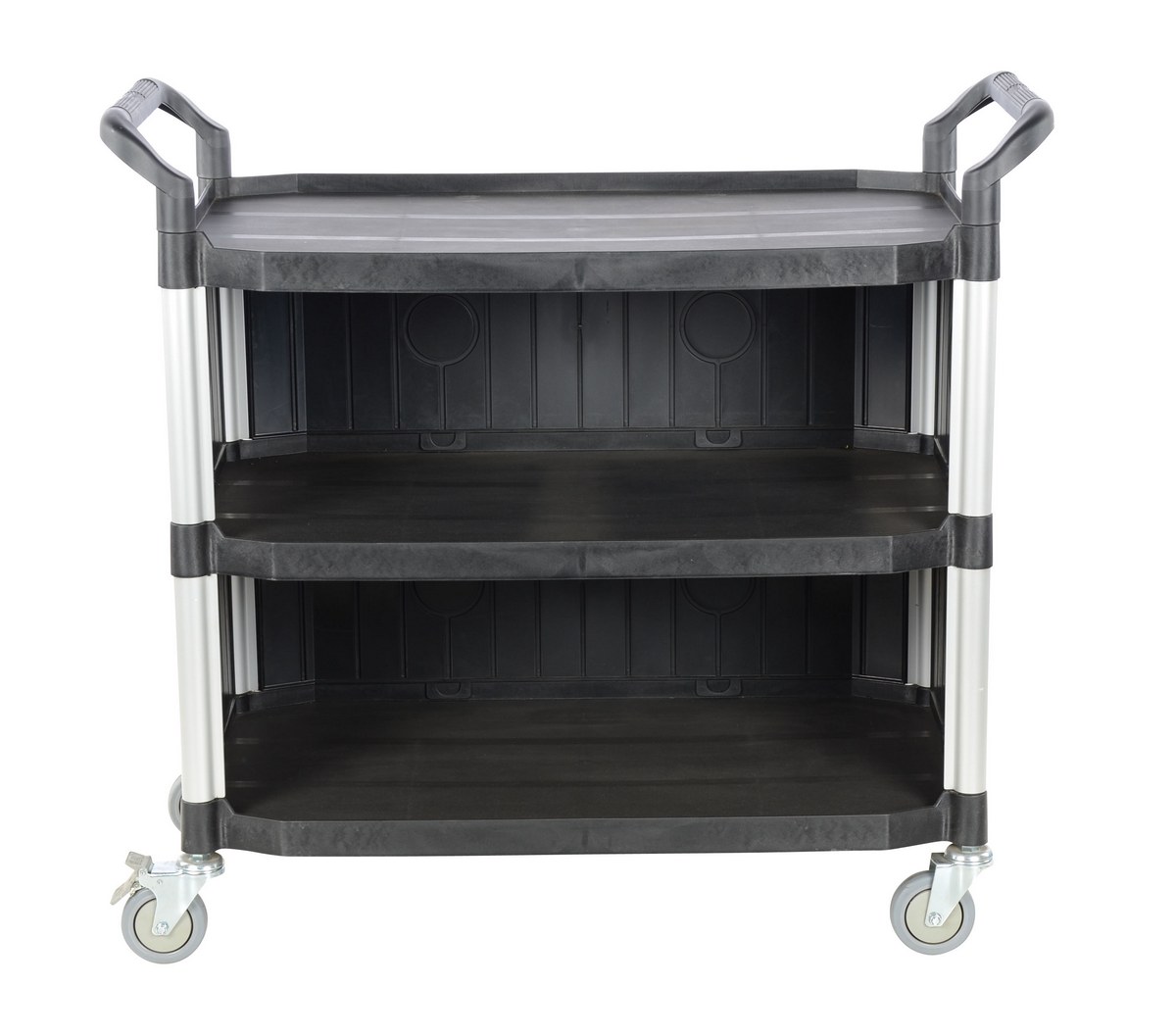 The food and service cart is ideal for the hospitality industry. The secure grip handles on the strong, yet, lightweight frame makes for easy maneuverability, while the low noise thermoplastic casters make transportation as quiet as possible. The steel constructed panels and slider drawer protects.