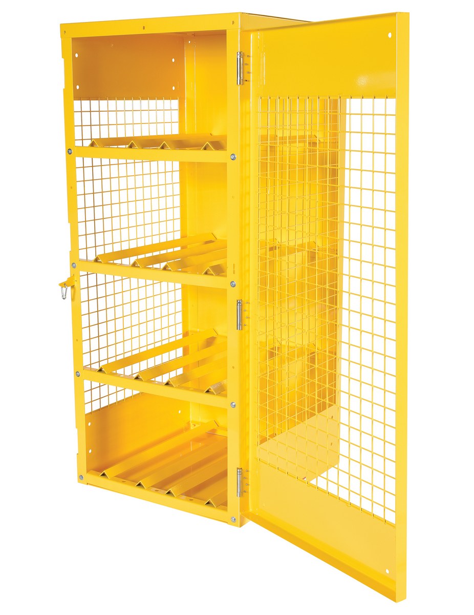 Steel cabinet for storage of cylinders. Cylinder storage capacity is based on cylinder size. Sides and door are made of expanded steel mesh. Bottom, back and top is made of solid sheet steel. Lockable doors protect cylinders (padlock not included). Base includes lag holes for securing cylinders. Rugged steel construction with safety yellow finish.