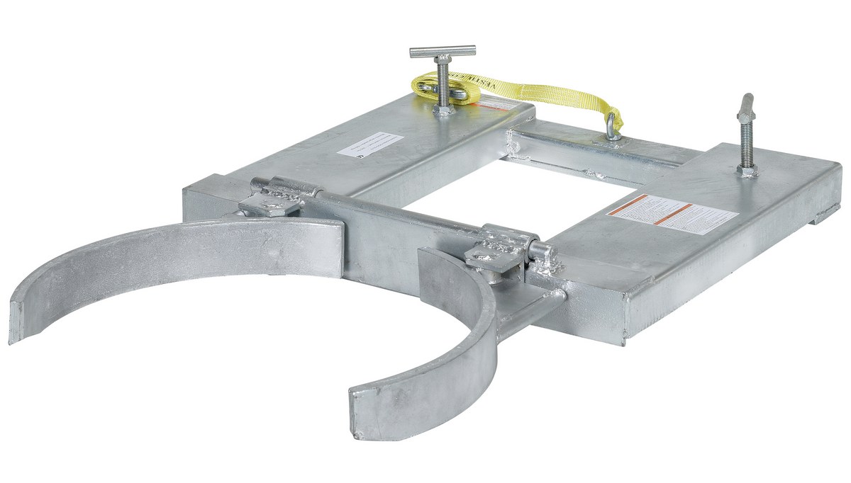 The drum grippers make it easy to pick up one or two open head (with lid installed and secured) and closed head steel drums without leaving the seat of the fork truck. Simply slip the forks into the fork tubes, fasten the safety restraint and the drum gripper is ready to go. The knuckle gripping system is lowered around the drum, gripped tightly, and then lifted into the air. Drum is automatically released by lowering the forks. All models feature hinged folding design for storage.