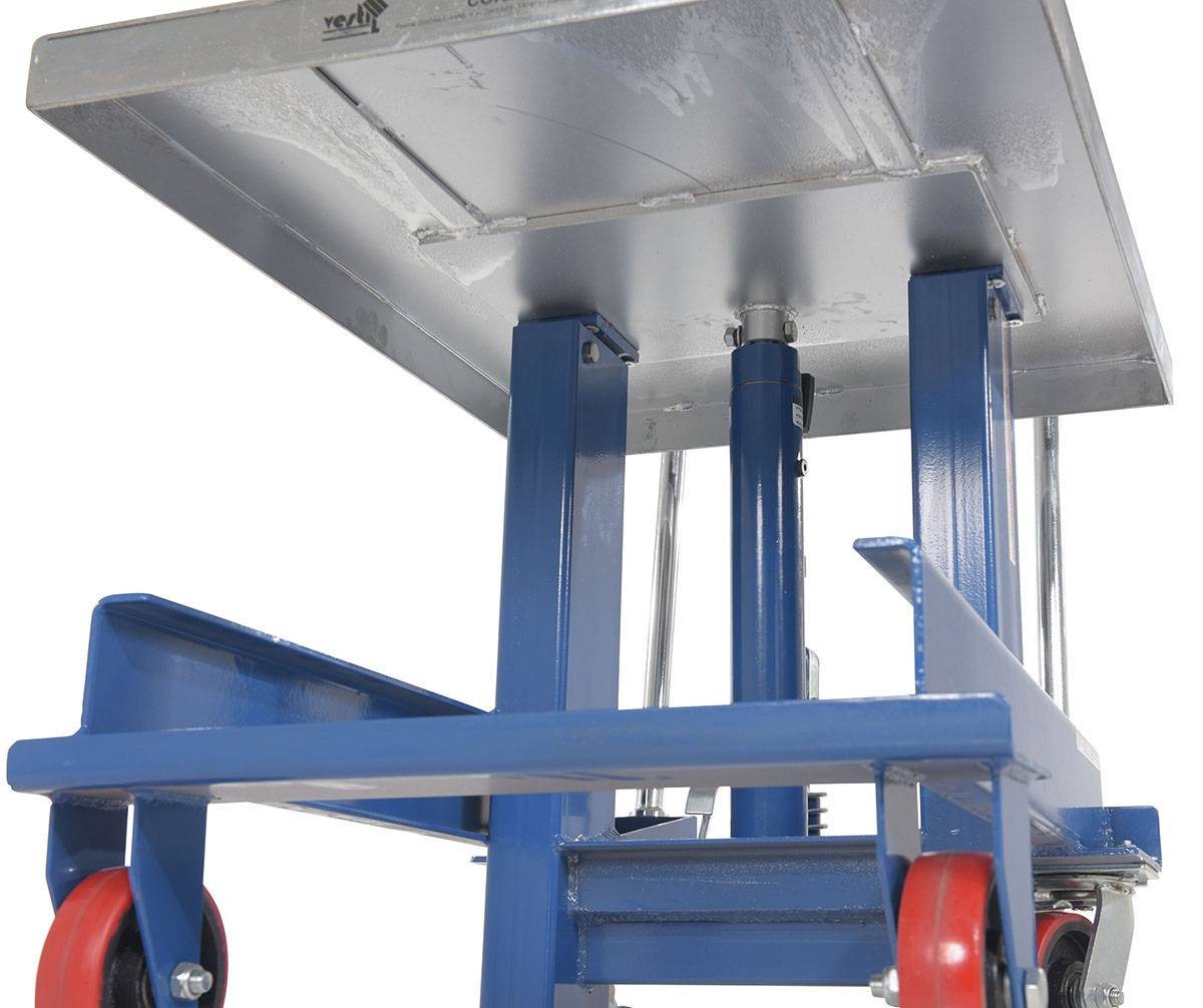 The die table is designed to lift heavy equipment to ergonomic working heights. Table is manually pushed from area to area. The all welded construction will provide years of service and hard work. The small frame size allows unit to access hard to reach locations.