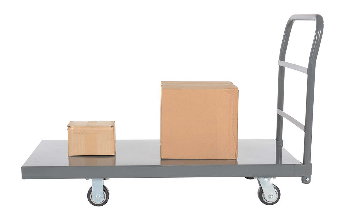 Steel Smooth Deck Platform Truck with 4 In. x 2 In. Mold On Rubber Casters 2000 Lb. Capacity GrayThis steel platform truck with a solid, smooth steel deck is all welded and features structural reinforcement underneath for extra strength. Includes one (1) removable high-polished steel handle and rolls smoothly casters. Comes standard with a floor lock.