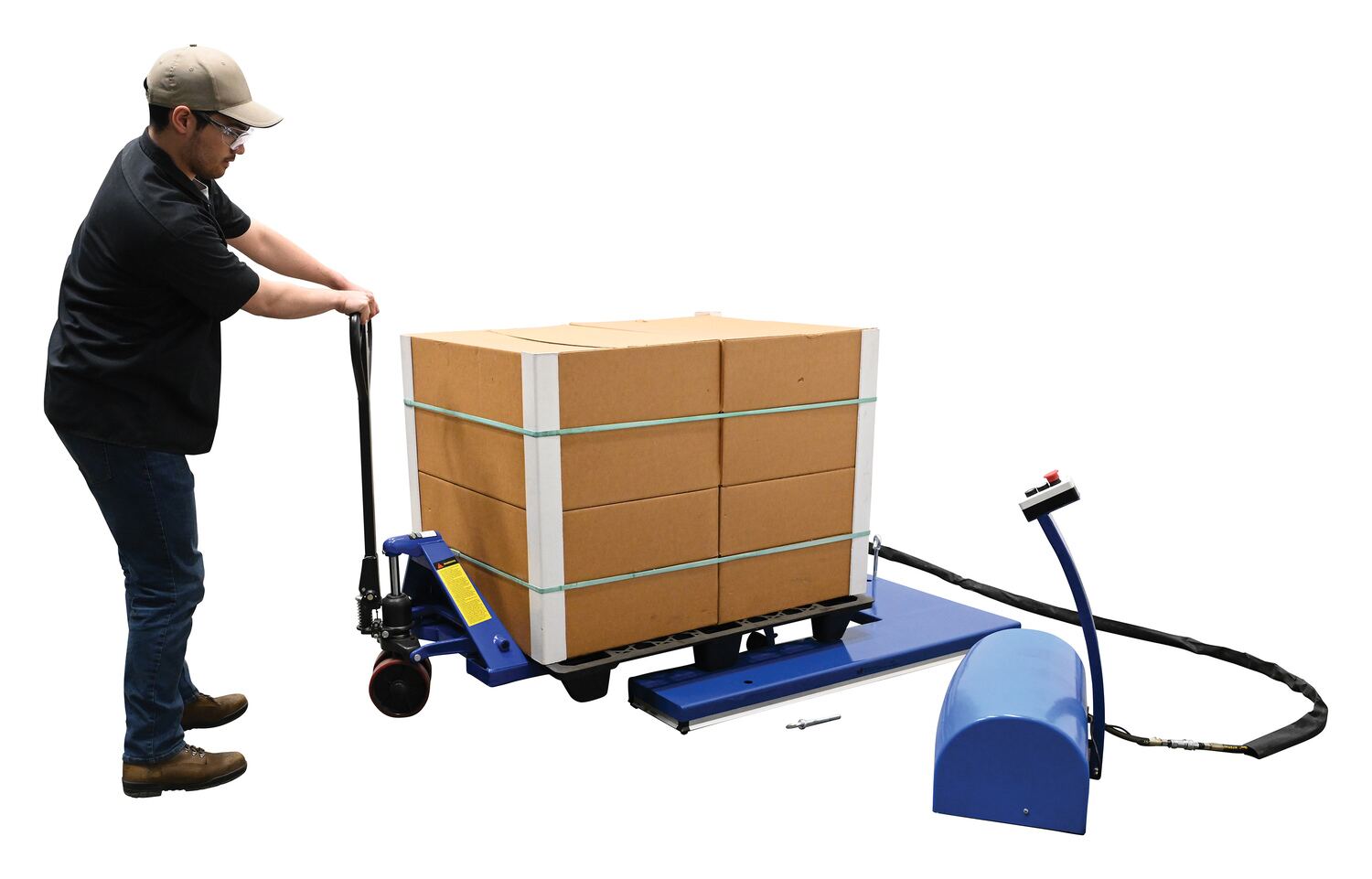Steel Low Profile Electric Lift Table E Type 56 In. x 52-3/4 In. x 3-1/2 In. 2000 Lb. Capacity BlueThe low profile electric lift tables are ideal for manufacturing and distribution facilities. The unique, steel constructed "E" design provides a center support beam to prevent the lifted product from deflecting downward in the center. Numerous protective features include electric toe guards, velocity cylinders, and emergency stop buttons, providing personnel with the utmost safety. An external power pack is equipped with a pressure relief valve which prevents overloading while controlling lowering speed. To raise and lower the unit, simply utilize the "up and down" push button design on the 24V control box for precise ergonomic positioning of product.
