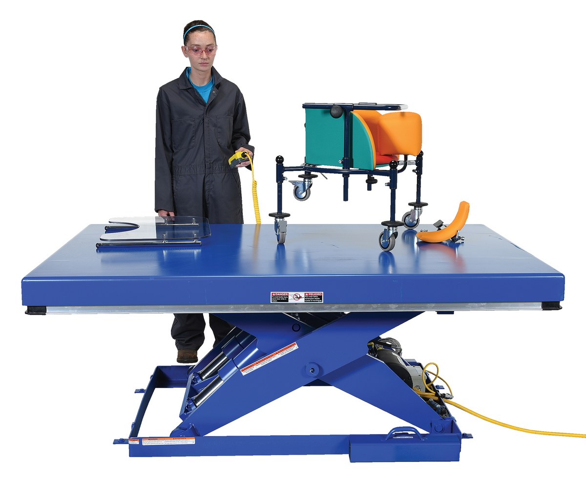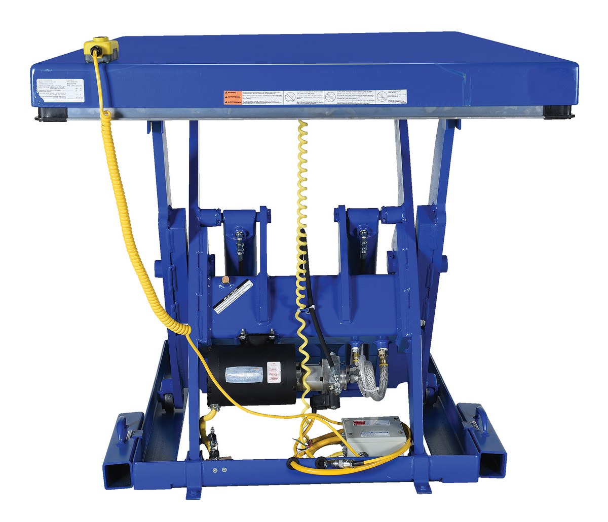 Steel Electric Hydraulic Lift Table 48 In. x 72 In. 6000 Lb. Capacity BlueThe electric hydraulic scissor lift table is used by all types of manufacturing and warehouse facilities. Safety features include a patented pinch point perimeter toe guard to protect pinch points while lowering the table, fused push button control, internal safety velocity fuse to maintain platform height in the event of hose or fitting failure, integral maintenance prop, adjustable upper travel limit switch to stop the table at maximum height, and displacement-style hydraulic cylinders for maximum strength. It also features a pressure plated pump, manifold system, and state-of-the-art lifetime lubricated bearings. The standard 56 frame electric motor is fully enclosed with additional voltage options available. Contact factory if platform dimensions are crucial.
