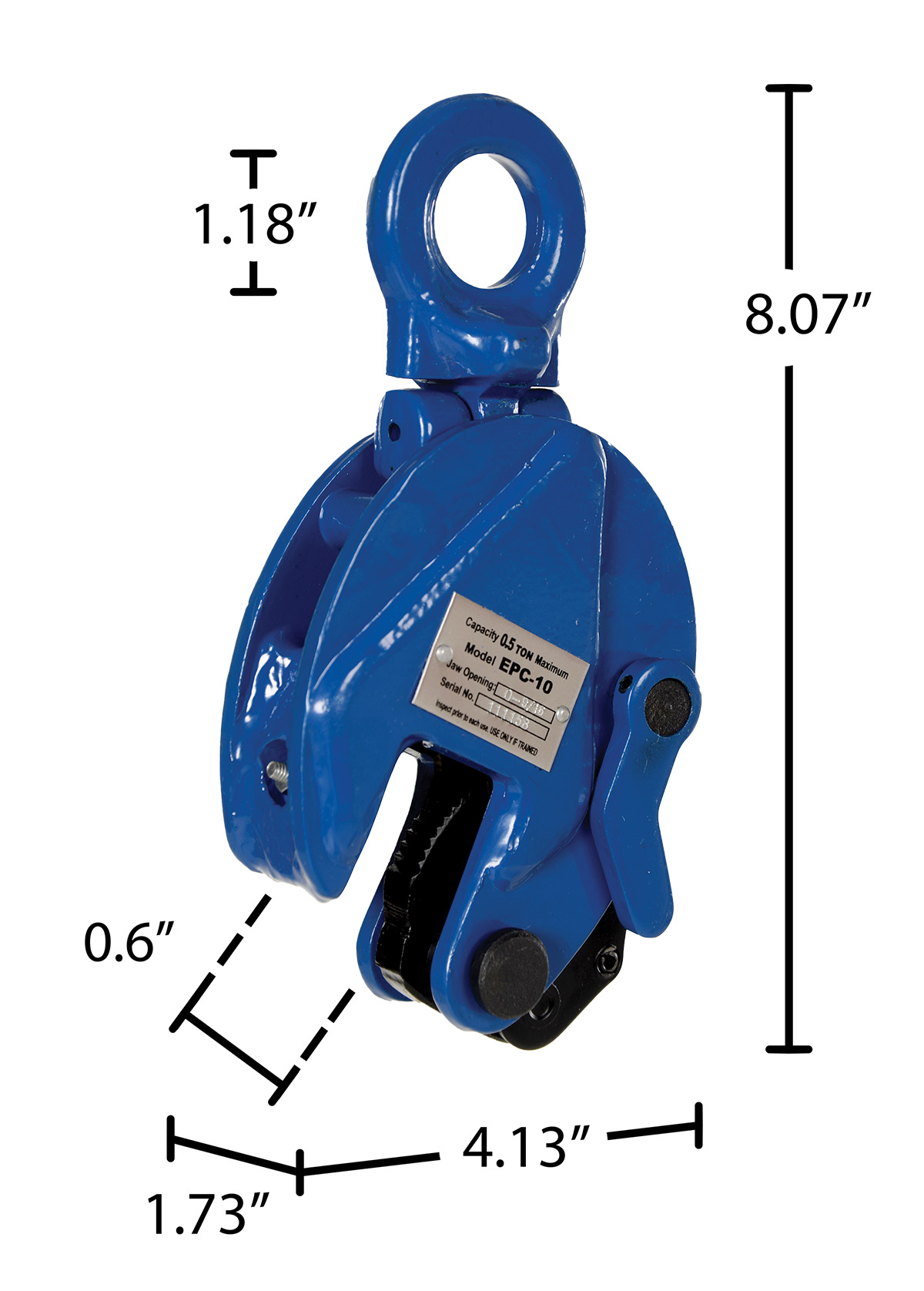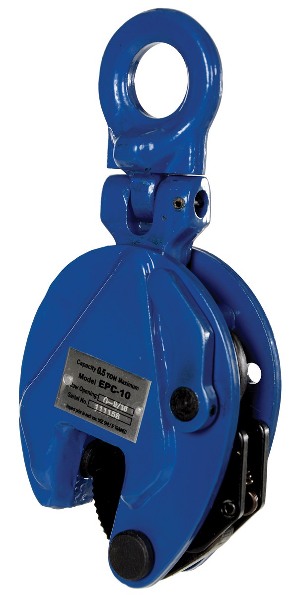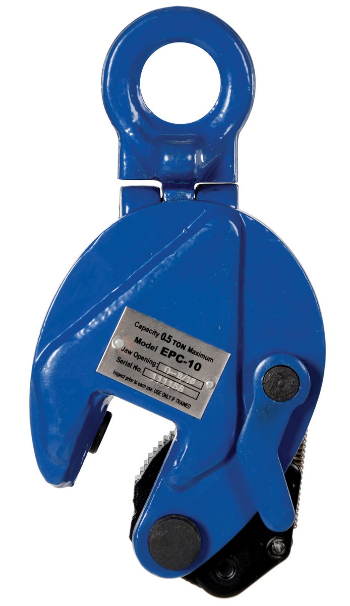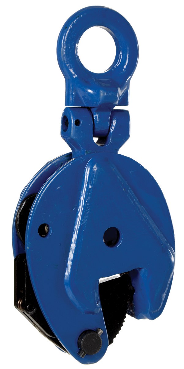 The vertical plate clamp has a pivoting bale for easier and more versatile operation. Features include an automatic serrated hardened steel cams and pads and a drop-forged steel case for maximum strength. Warning: do not exceed the working load limit. Serious bodily injury or property damage may result. Lift only one clean and oil free plate at a time. Not designed to use on stainless steel or aluminum plates. For use with materials with a surface hardness of 30 RC (300 HB).