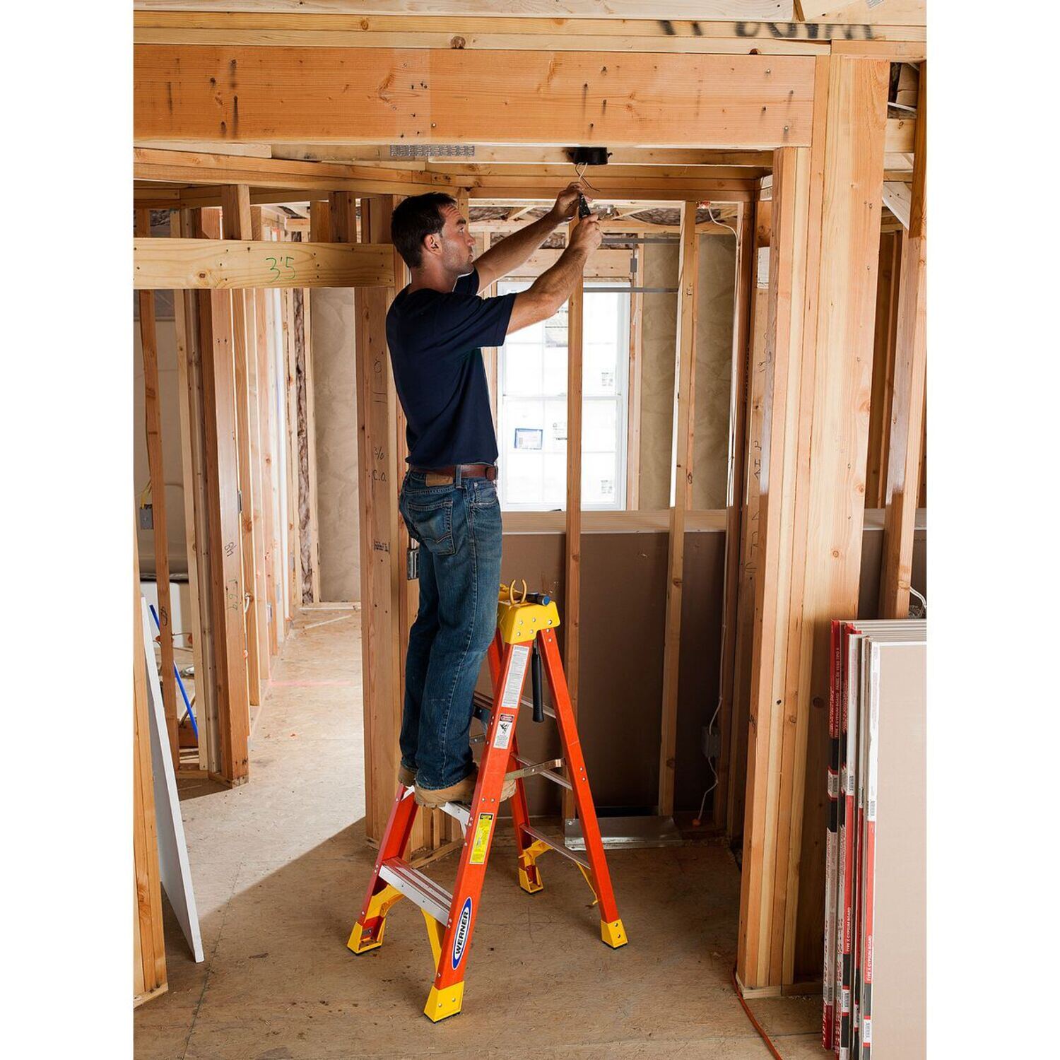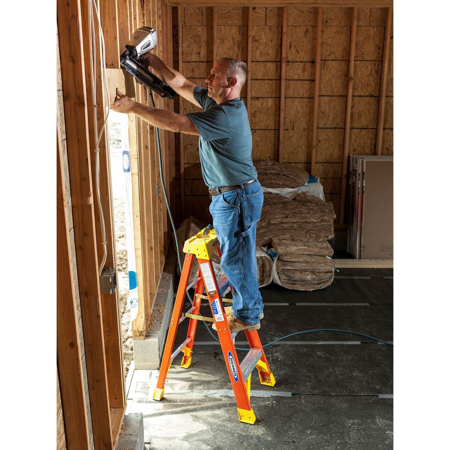 • Fiberglass stepladder is equipped with slip-resistant footing