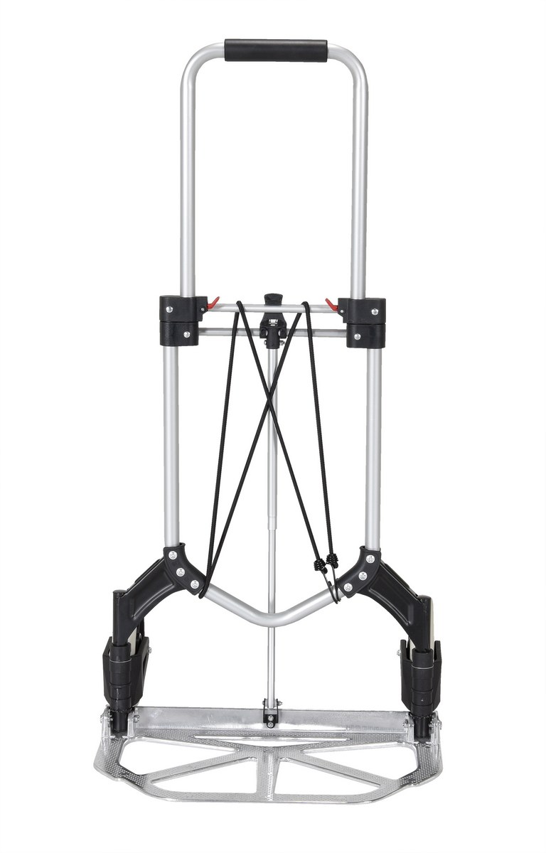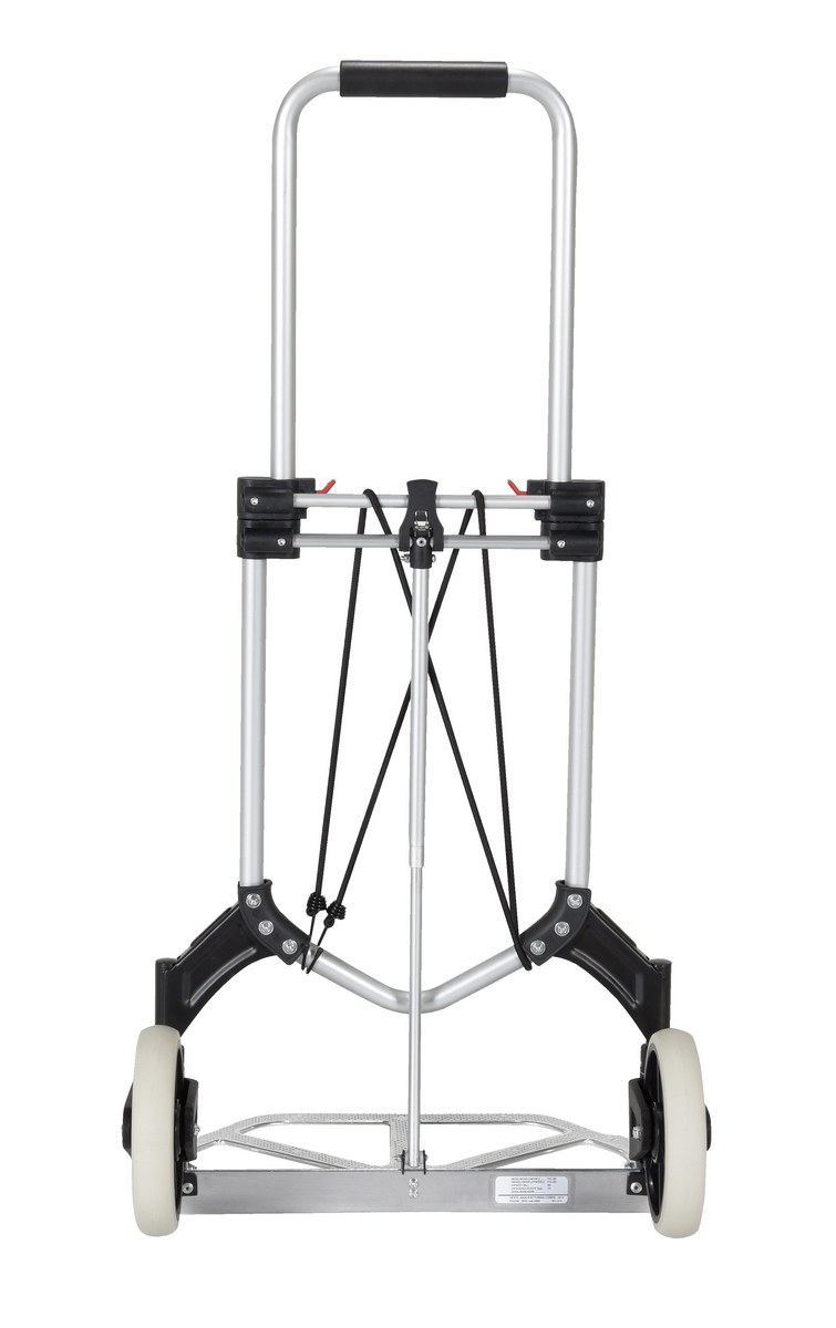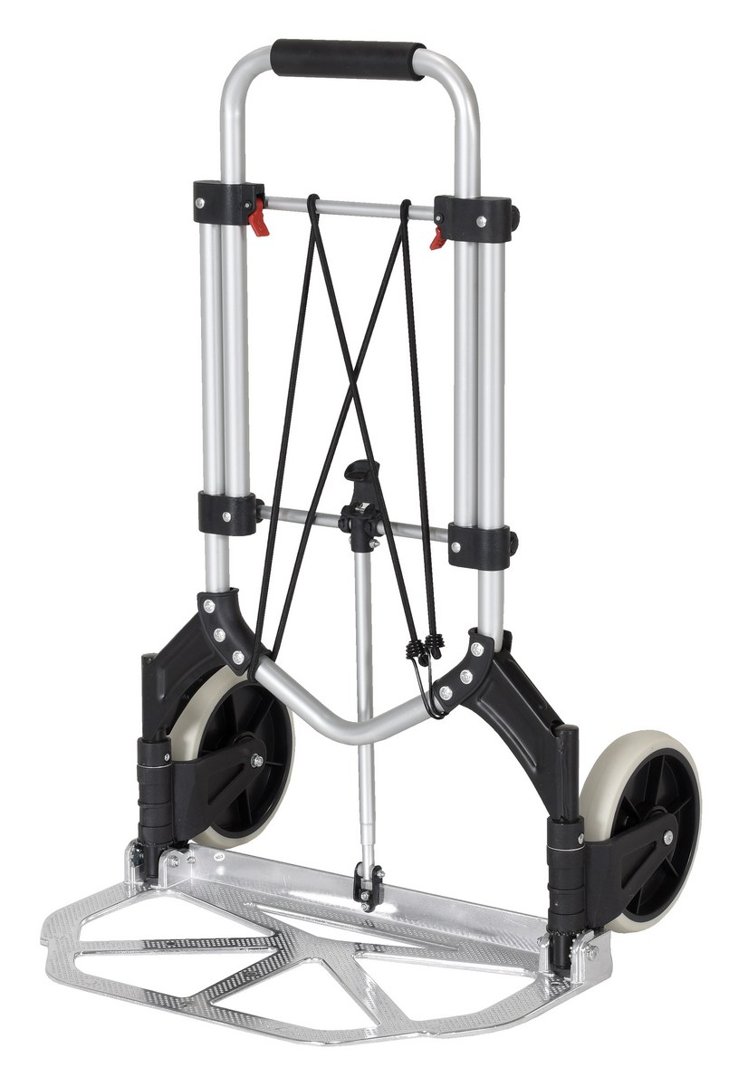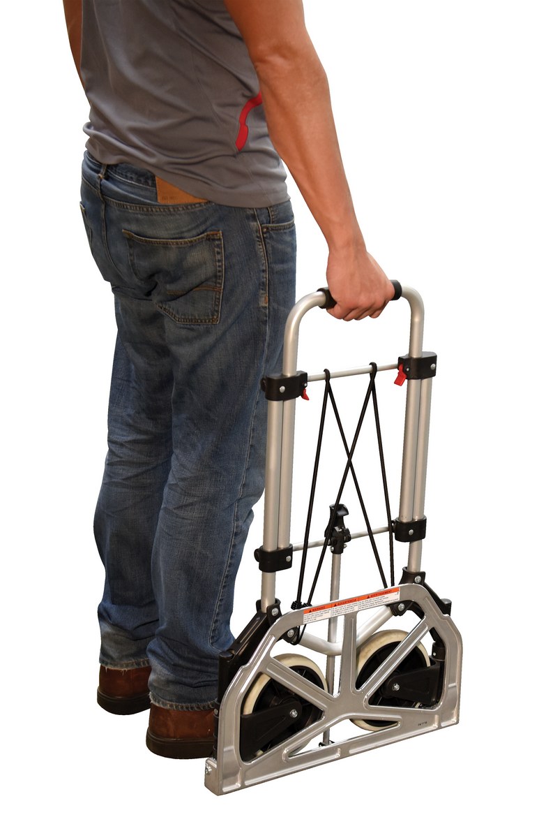 Foldaway Hand Truck, designed for everyday all purpose use. The handle and wheels fold up quickly and easily allowing you to store it in tight spaces such as trunks of cars, under tables, or in closets.