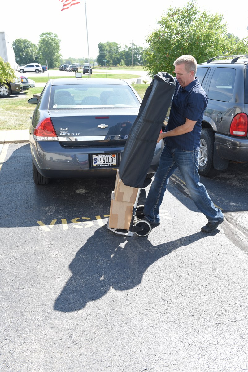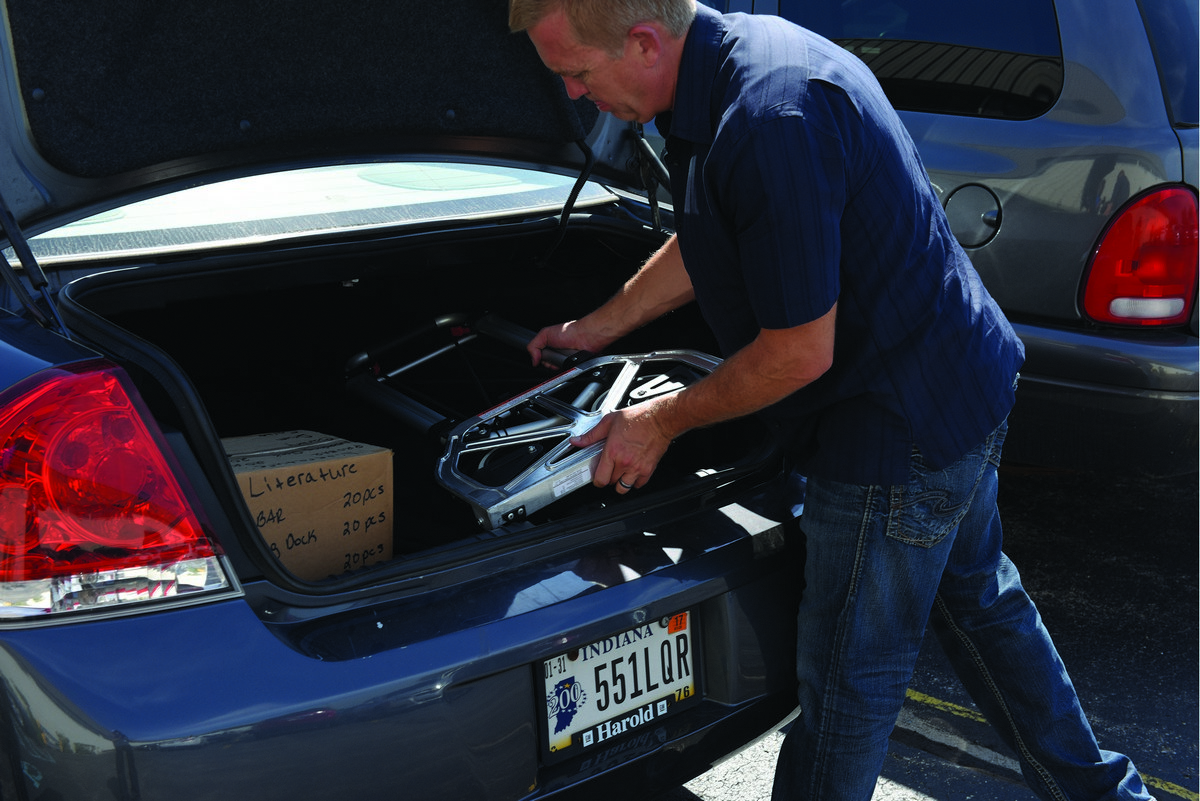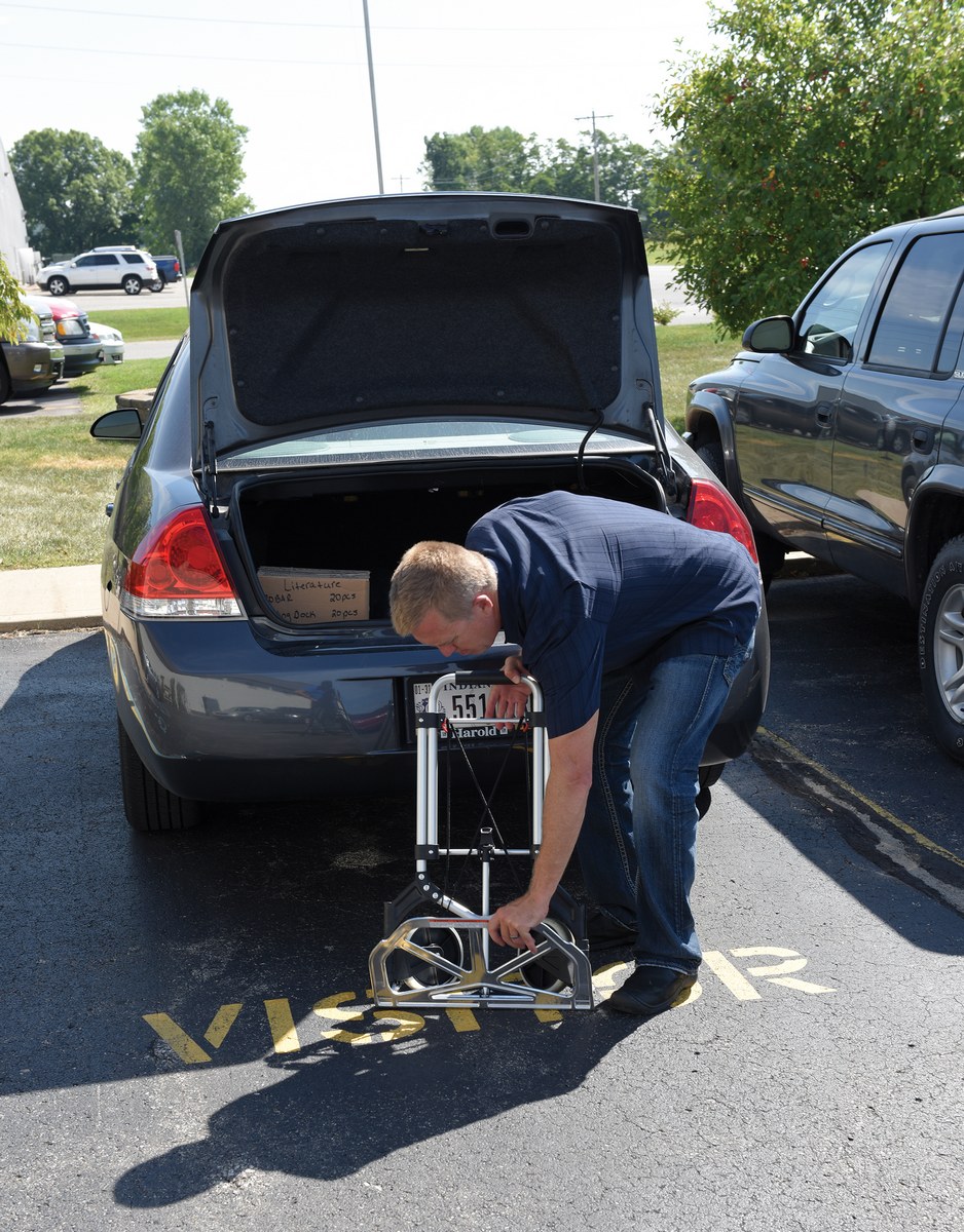 Foldaway Hand Truck, designed for everyday all purpose use. The handle and wheels fold up quickly and easily allowing you to store it in tight spaces such as trunks of cars, under tables, or in closets.