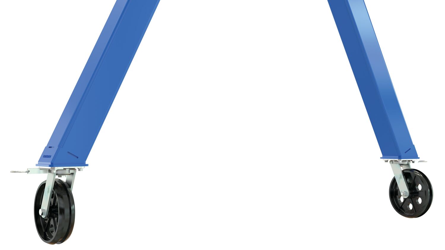 Steel Knockdown Fixed Gantry Crane with V-Groove Ductile Steel Casters 10 Ft. 4000 Lb. Capacity BlueThe fixed height knockdown industrial steel Gantry cranes are uniquely designed to be disassembled when not in use for compact storage and easier transportation / shipping from one job site to another. Facilitate easy mobility from one area to another with total locking casters. The total locking casters lock the rigging in any position and locks the wheel from rotating. Features quick setup design. Do not move units while loaded. Painted blue finish. Designed for semi-permanent or permanent applications. Requires assistance from fork truck to set-up.