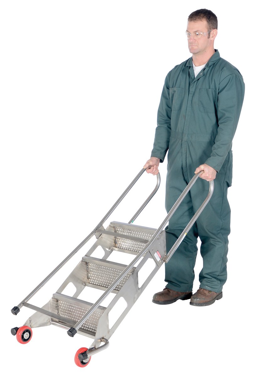 The folding ladder with wheels has a locking foldable design that saves on storage space when ladder is not in use. Ladder folds after unlocking spring-loaded detent pin. Once unit is folded, tilt back on wheels for easy portability. Ladder is carbon steel. The steps are perforated to provide a non-slip surface.