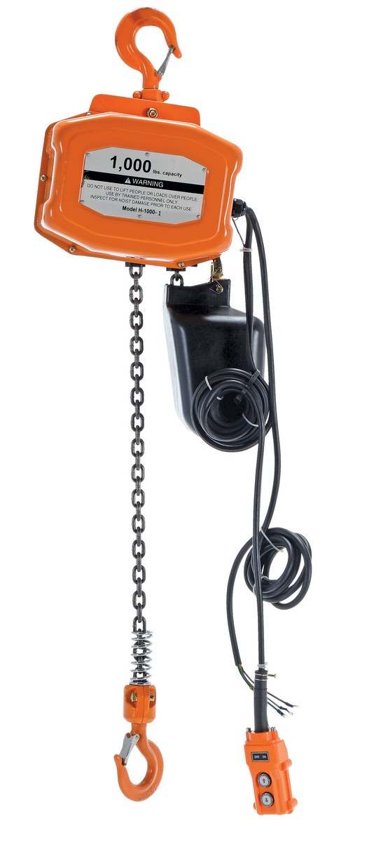 Steel Economy Chain Hoist with Chain Container 1 Phase 1000 Lb. Capacity OrangeThis compact economy Chain Hoist with chain container features a high efficiency motor with convenient push-button operation and single phase power. This hoist is dust and water resistant, load limit fitted, and features a 4:1 safety factor. Chain container included.