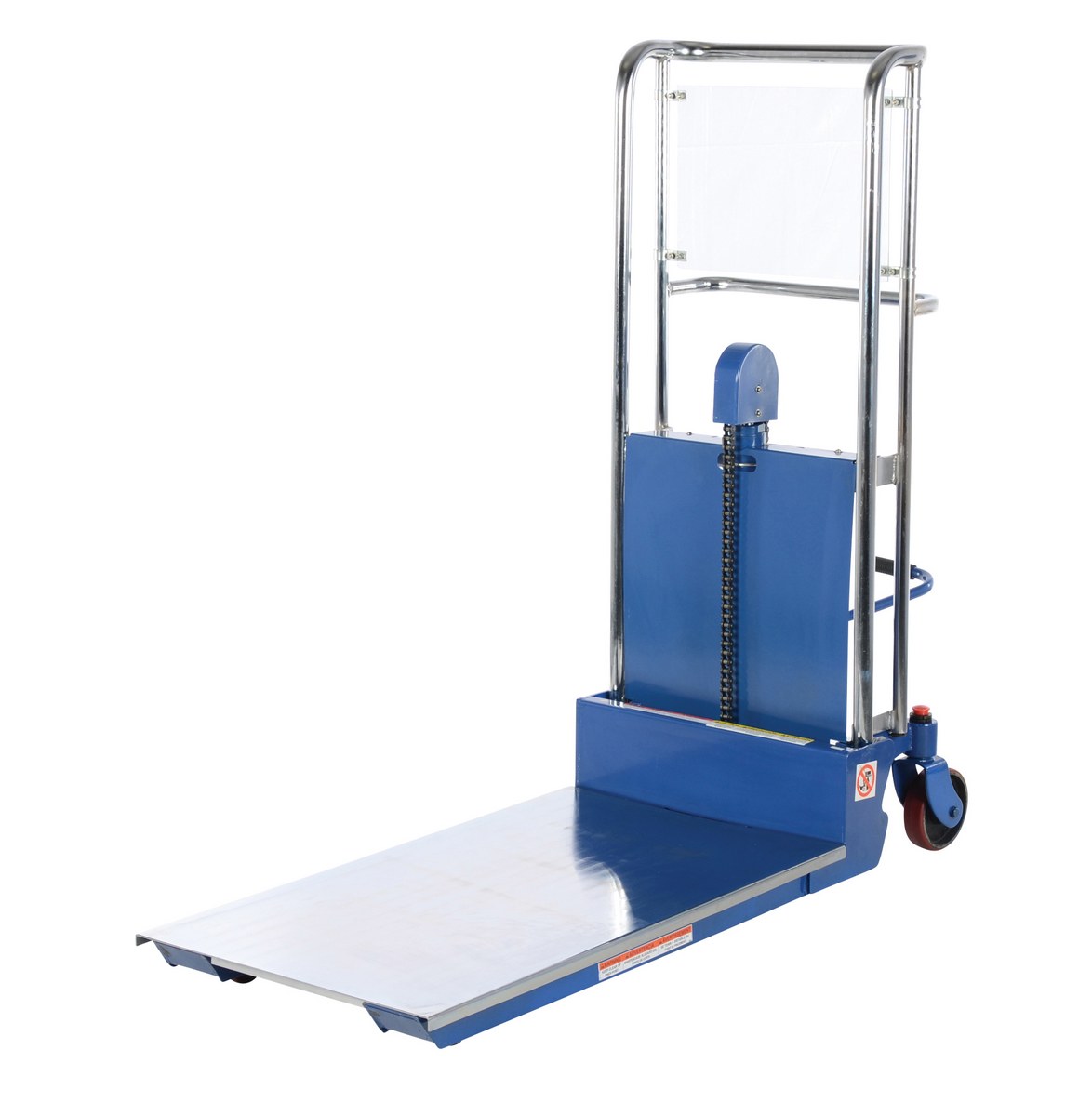 The Hefti-Lift is a user friendly, portable hydraulic lift. The lift provides reliable, power lifting when moving and positioning loads. It includes a removable platform for operation requiring forks. The non-slip chain is used for accurate positioning while the lift rolls easily on two rigid and two swivel poly-on-steel casters that includes a foot operated brake. The lift is all welded construction with a chrome platform and uprights. Not for use with pallets.