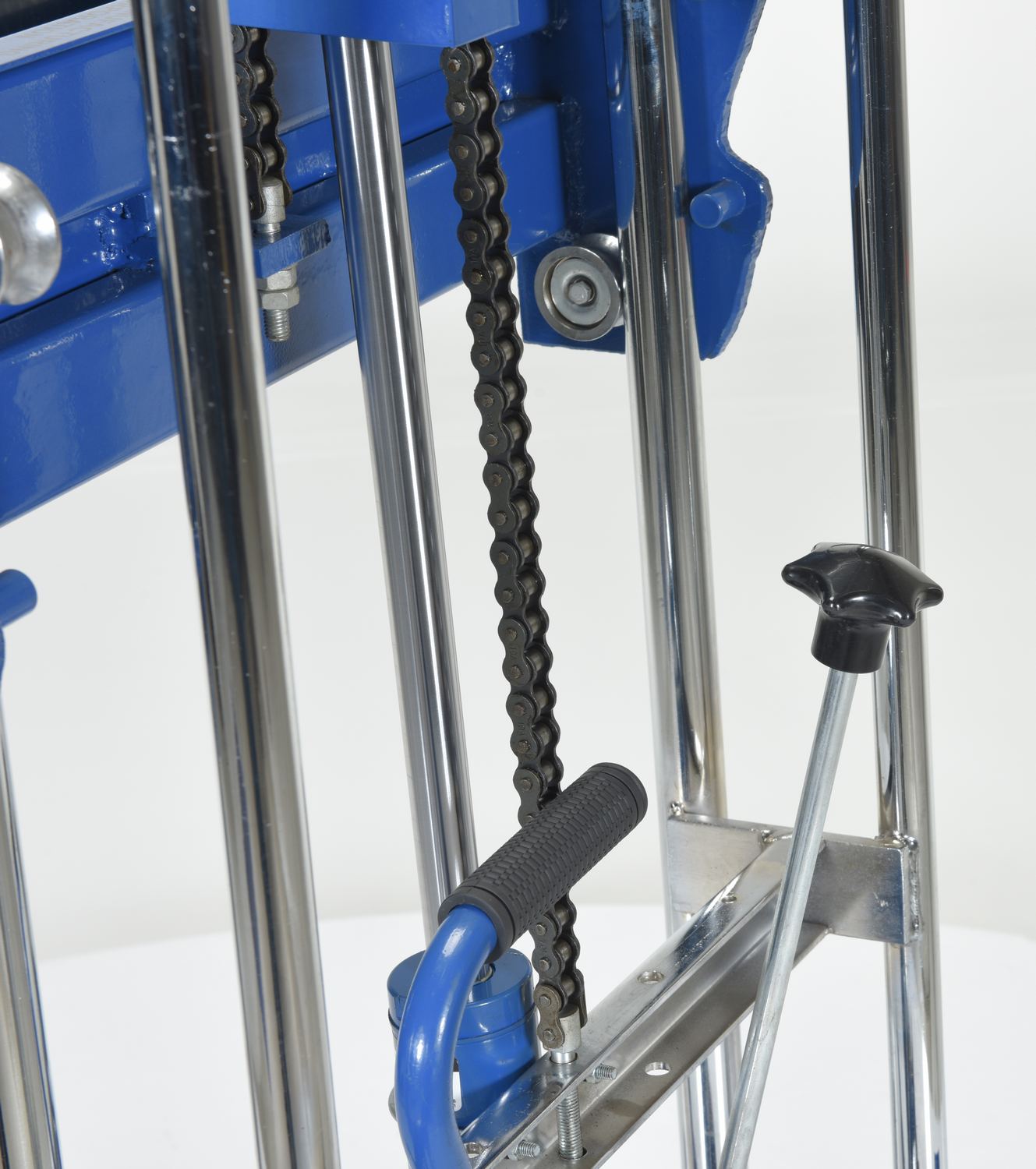 Steel Roller Work Positioner 21 In. Roll Diameter 800 Lb. Capacity BlueThe roller work positioner is a wonderful addition to material handling and shipping facilities. The positioner allows the user to transport heavy large rolls of material with ease. The simple cradle design of the platform prevents any movement during transporting. A foot pump operation gives the user the ability to adjust the height to an exact measurement for smooth loading/unloading. The attached handle stands at an ergonomic height to diminish the chance of bending during operation. For best use, simply slide the product onto the cradle platform and use the foot pump to adjust the height that best suits the environment.