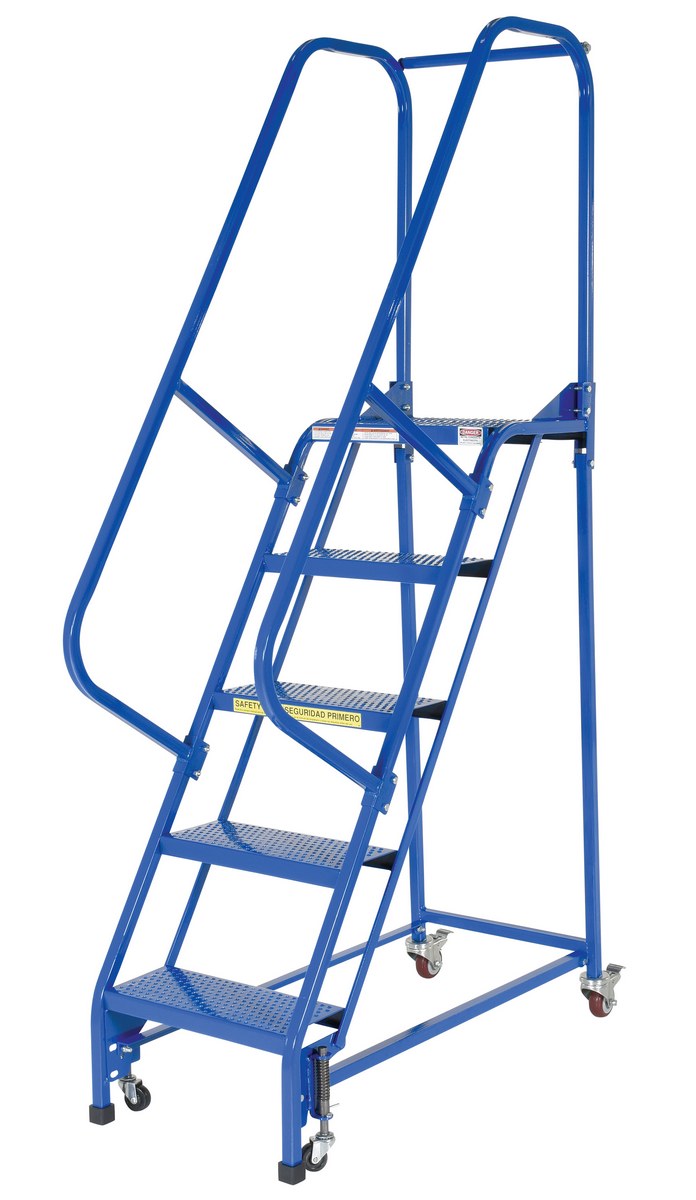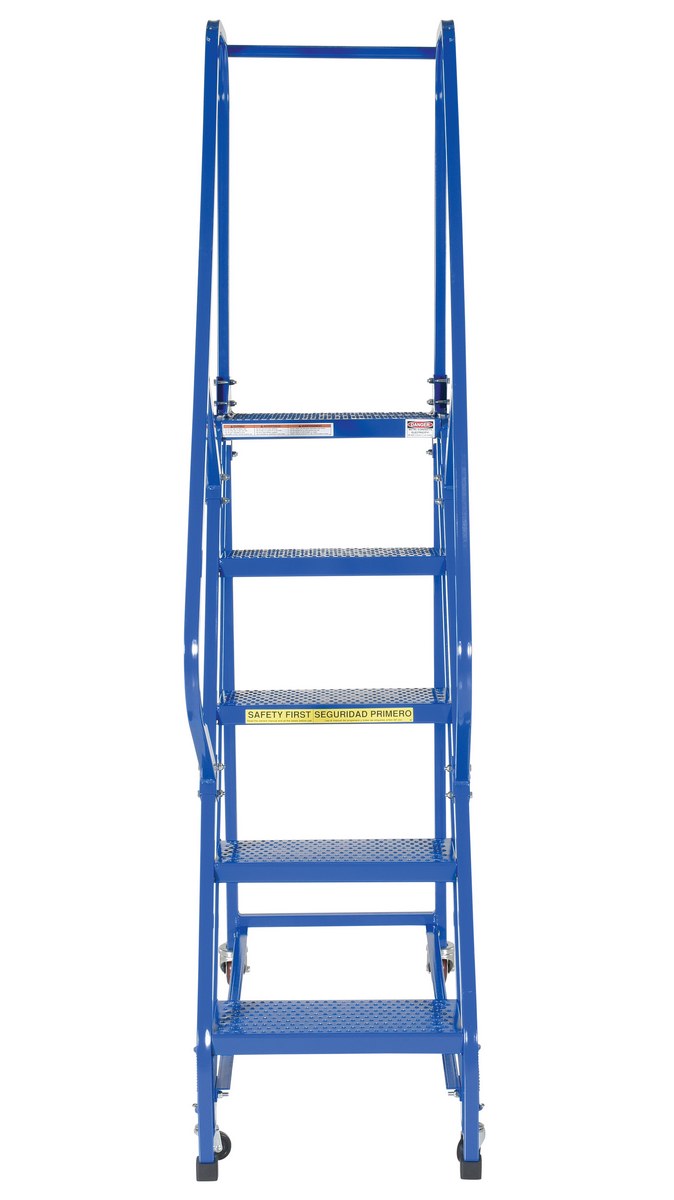 The standard slope ladder is a portable warehouse ladder for every-day use applications. Perforated steps, handrail included and welded square tubular steel construction with powder-coat blue finish. Rubber feet provided for floor protection. Unit has (2) two all directional spring-loaded swivel casters and (2) swivel casters with total locks. Ships fully assembled and ready to use.