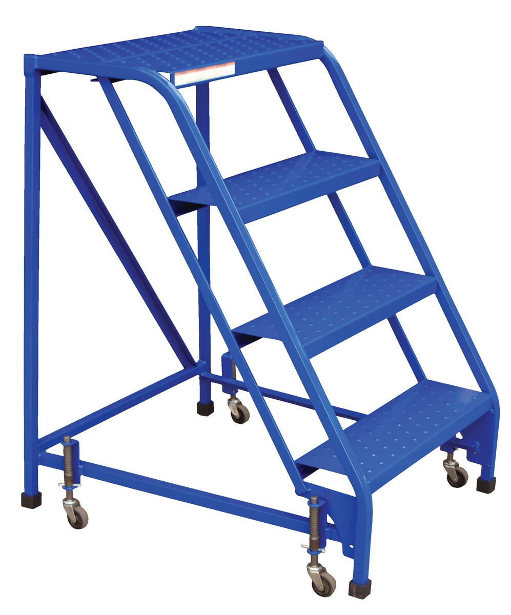 The standard slope ladder is a portable warehouse ladder for every-day use applications. Grip strut steps, no handrail and welded square tubular steel construction with powder-coat blue finish. Rubber feet provided for floor protection. Unit has (2) two all directional spring-loaded swivel casters and (2) swivel casters with total locks. Ships fully assembled and ready to use.