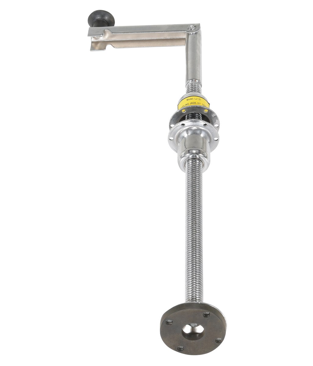 This leveling jack is designed for permanent installation, screw-style jack hold platforms and other equipment in place and stabilize them at the required height. Drill a one and one quarter inch (1-1/4") diameter hole through the platform to be leveled and bolt the platform between the upper and lower flanges of the jack's divided housing. Jack has a handle that folds down when not in use. Swivel base has a slip-resistant rubber pad on the bottom (replacement pads available).