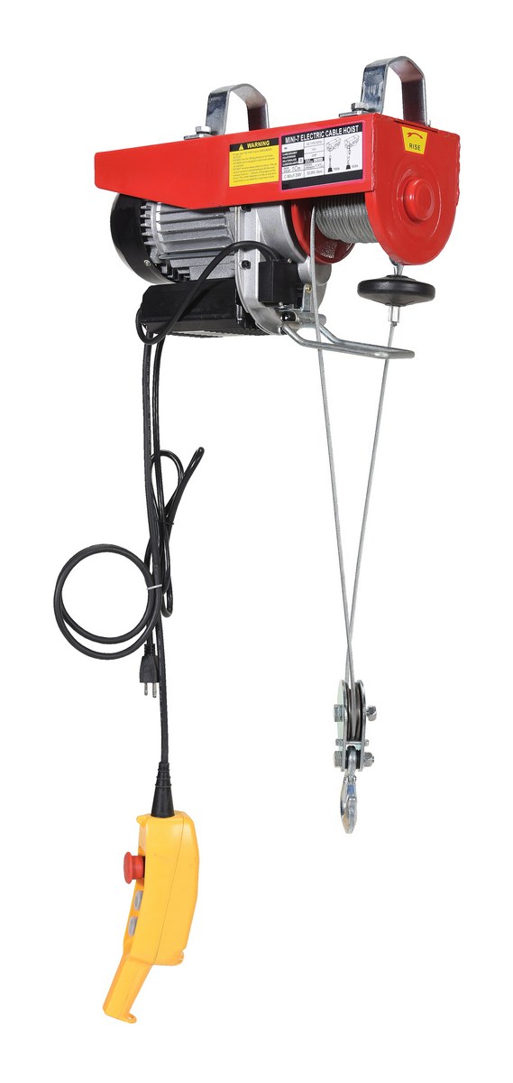 Steel Mini Cable Hoist Option 16 In. x 6-1/4 In. x 10 In. 750 Lb. Capacity RedThis mini cable hoist can be used in both single-line and double-line lifting applications. Includes electric motor and hand-held push button controls. Optional swivel hook plate must be ordered for attaching hoist to trolley, (trolley not included).