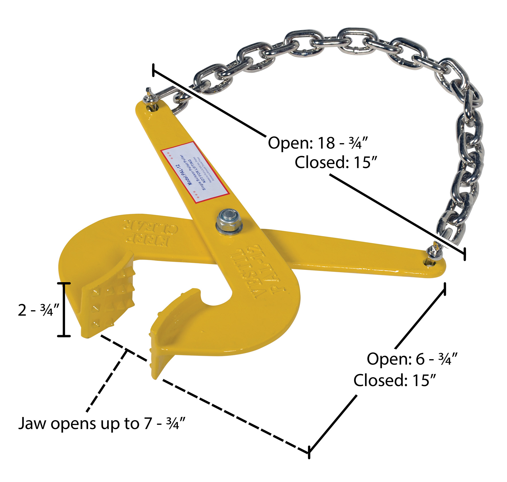The pallet puller is used to pull pallets to rear of trailers for easy fork truck access. Made of rugged steel construction. Heads are self-cleaning and unaffected by wood particles, paint or grease. The single scissor action allows for wider jaw opening. the pallet puller is not designed for lifting.