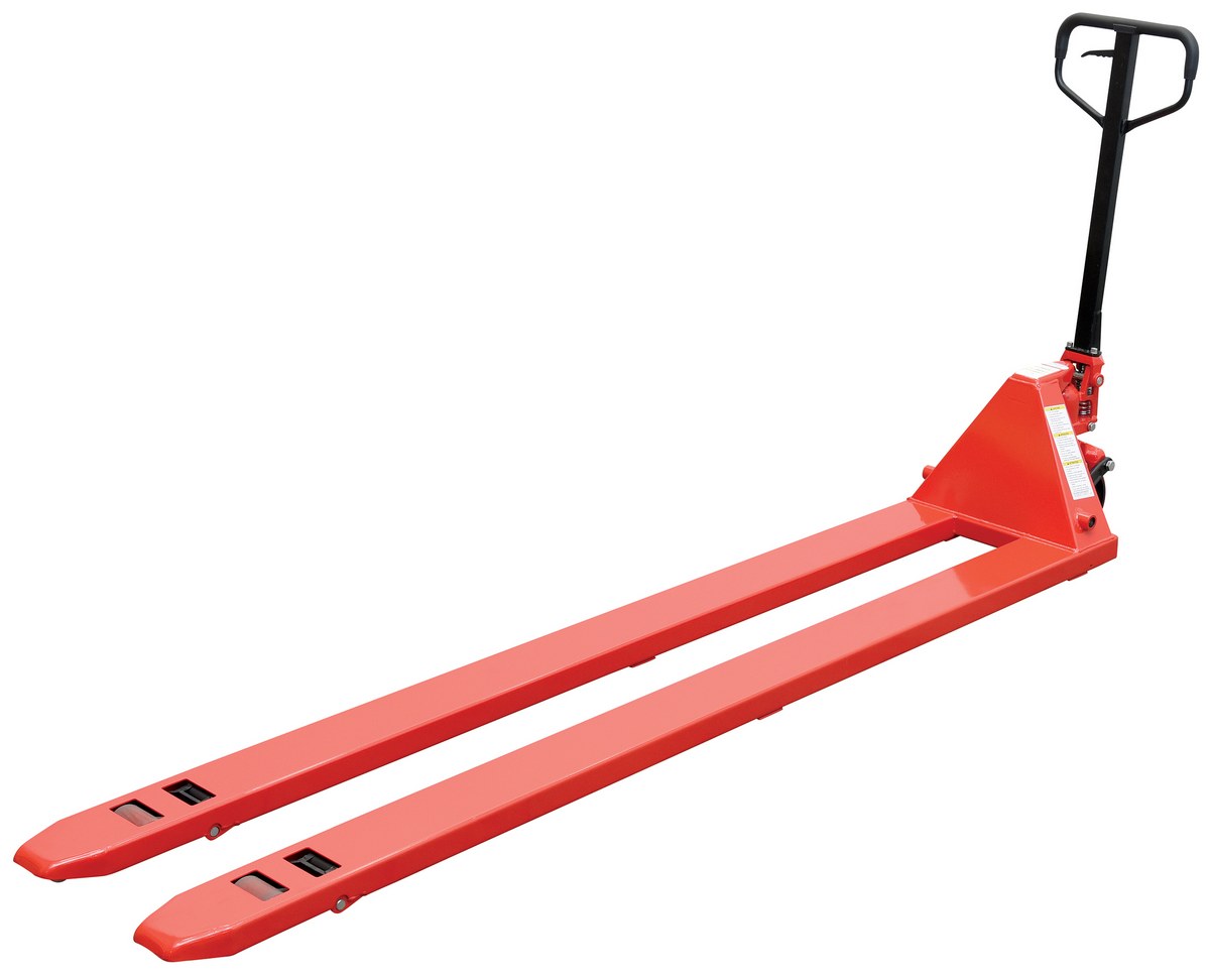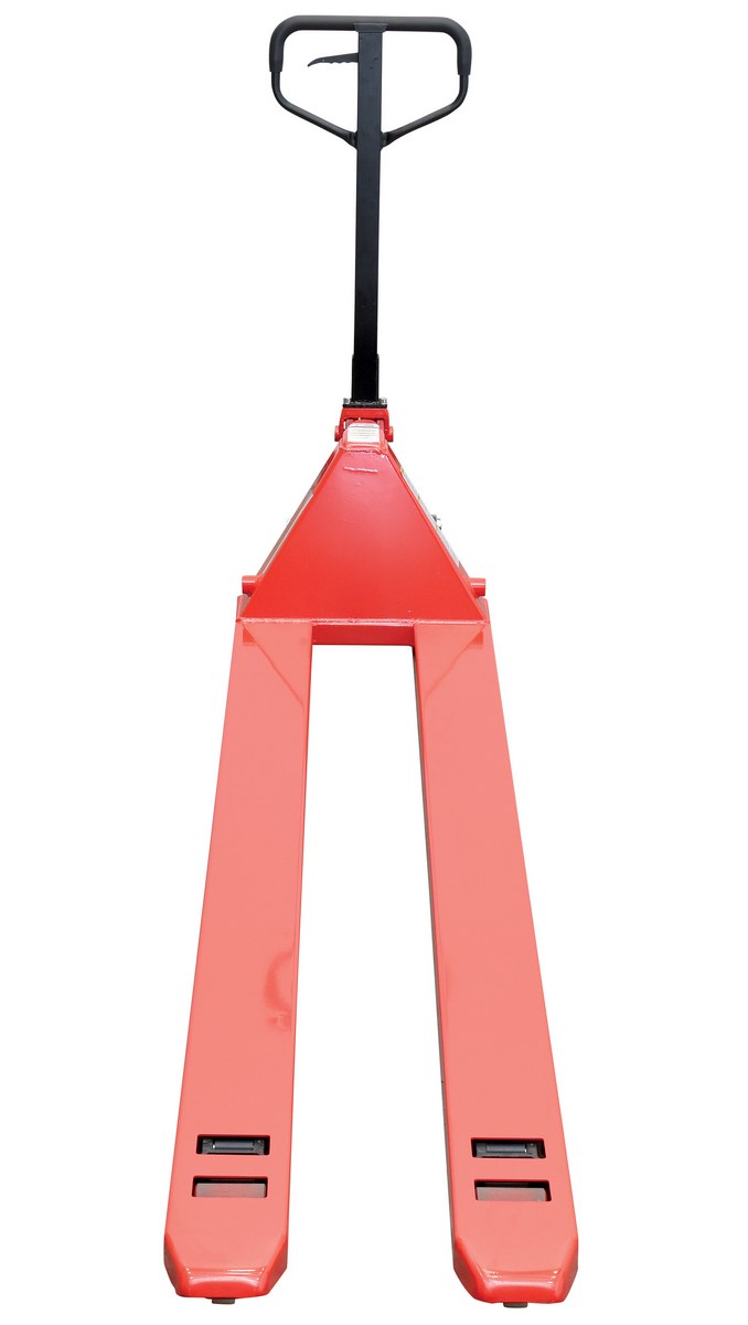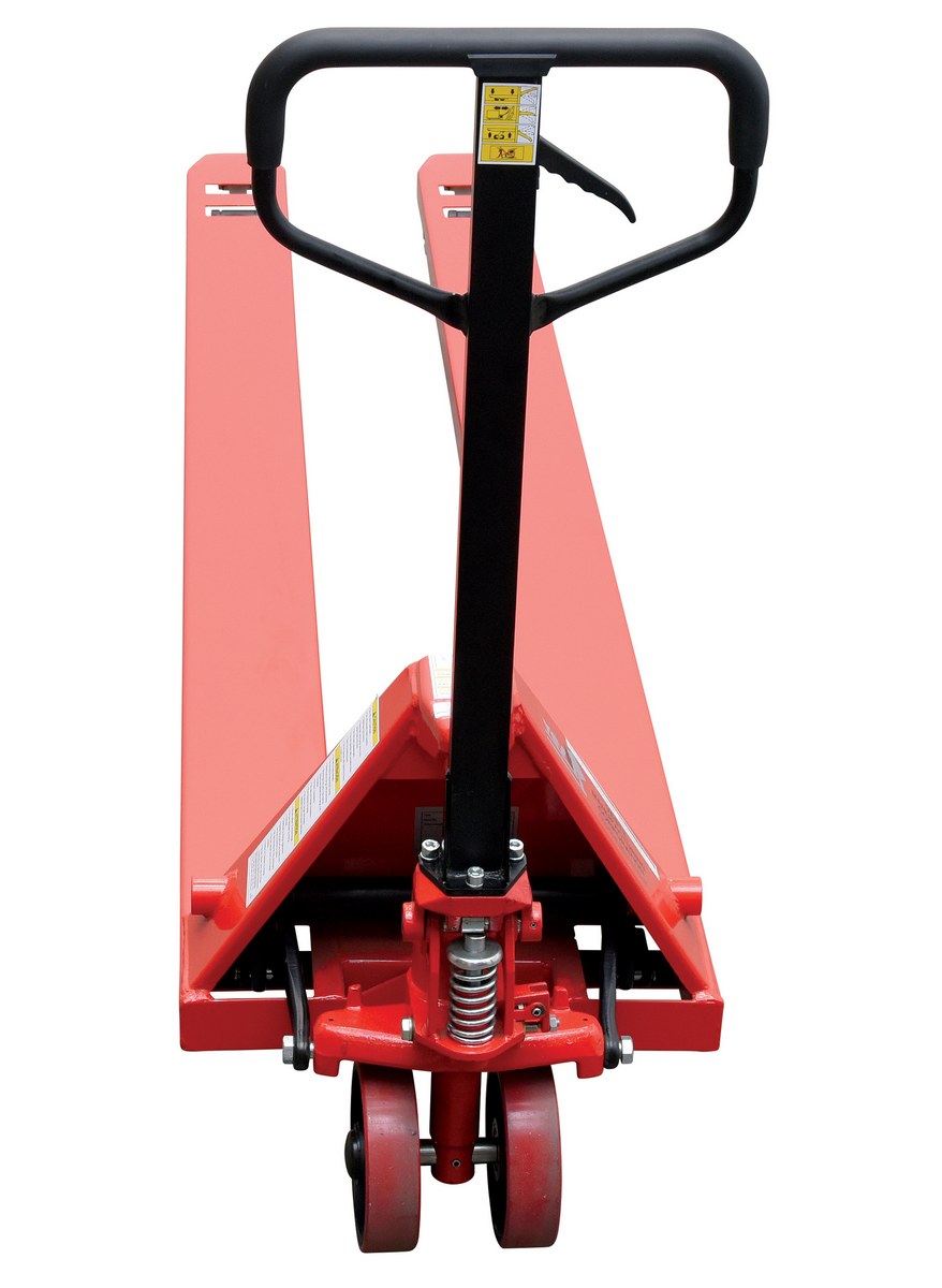 An economical way for one person to move heavy pallet loads without the use of a fork truck! Includes two articulating steering wheels and two front load rollers. Ergonomic design requires only 75 pounds of pulling force when fully loaded. Steering wheels include bearing dust covers for added life. Nose wheels are located on the front edge of each fork to assist in clean pallet entrance and exit. Reinforced triple-formed steel forks provide twice the strength of standard single-formed forks. Equipped with internally mounted solid steel adjustable push rods. Spring loaded handle automatically returns to vertical position when not in use. Hydraulic pump design facilitates easy-access seal replacement. Chrome-plated hydraulic pump piston for long seal life.