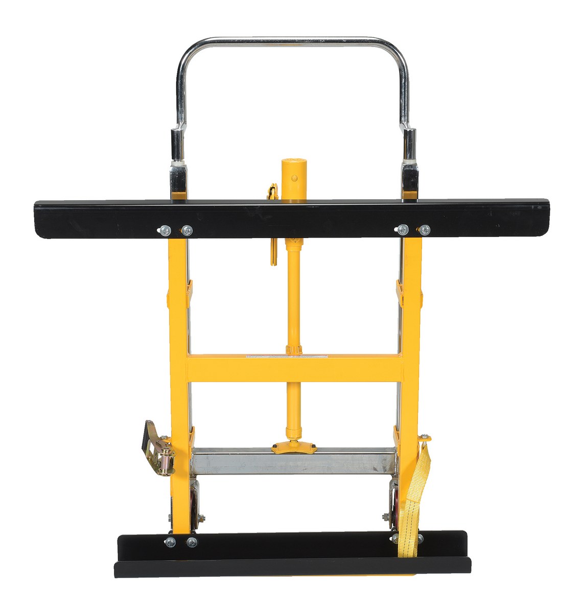 Steel Pallet Rack Lifting Dolly 10 In. x 46 In. x 49-1/4 In. 750 Lb. Capacity YellowThis pallet rack lifting dolly is designed for moving empty fully-assembled pallet racking. Lifting dolly jack includes hydraulic pump to raise pallet rack frame. Frame must have low cross-bar for proper usage. Safety strap is used to secure lifting dolly to pallet rack frames. Steel construction with painted finish. Optional dollies are used to hold frame feet.