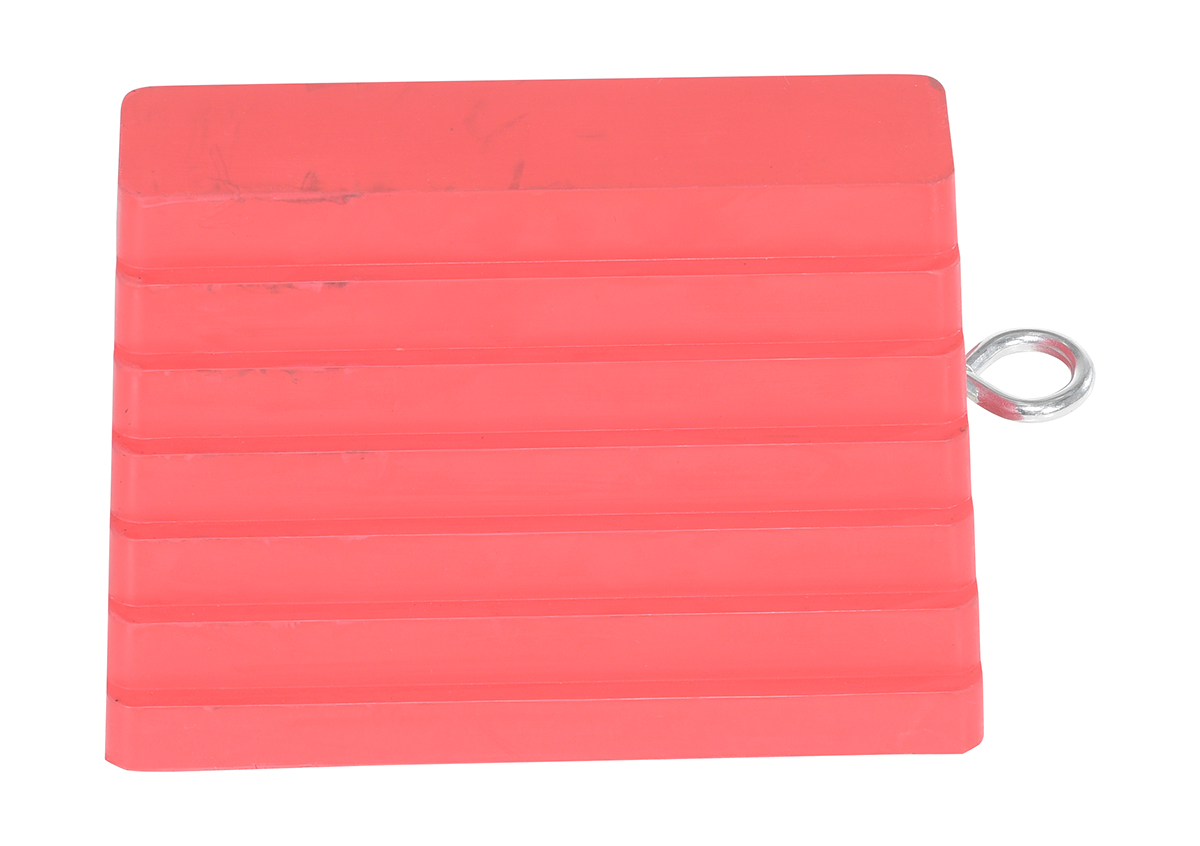 Rubber Wheel Chock with Eye Bolt 9 In. RedA rubber wheel chock is perfect for on the road or in the shop. The tiered rubber design enables the chock to hold more surface area, providing a secure tire position. With a compact, lightweight construction the chock is simple to handle and takes up minimal storage space. Eye bolt is included, giving the user the ability to add additional security to the chock.