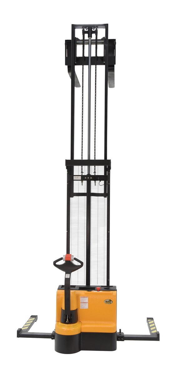 Double mast fully powered electric stacker transports loads throughout warehouse facilities quickly and with less effort. High torque drive and lift motor handles heavy-duty jobs. Ergonomic handle features easy-to-operate throttle with infinite adjustment of forward and reverse speeds, lift/lower controls, proprietary safety-enhancing emergency reverse function, and horn. Includes an electromagnetic disc brake with automatic dead-man feature that activates when user releases the handle. Powered lifter has two lead acid deep cycle batteries, integral battery charger, and battery level gauge. Horn included. Stacker rolls smoothly on poly-on-steel steer and load wheels. 3-4 hour operation at full charge - 8 hours when used intermittently.