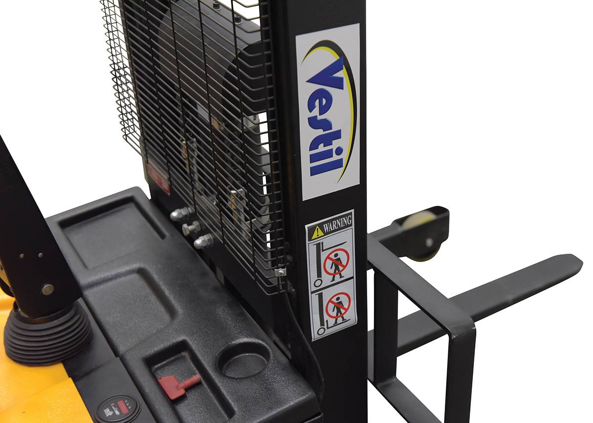 Steel Adjustable Double Mast Stacker 43 In. Raised Height 3,000 Lb. Capacity Black / YellowA fully powered electric stacker transports loads throughout warehouse facilities quickly and with ease. Ergonomic handle features lift/lower controls, adjustable forks/adjustable legs and horn Stackers can be easily maneuvered in condensed areas where space is limited. Steel construction with a powder coated for built in toughness. Horn included.