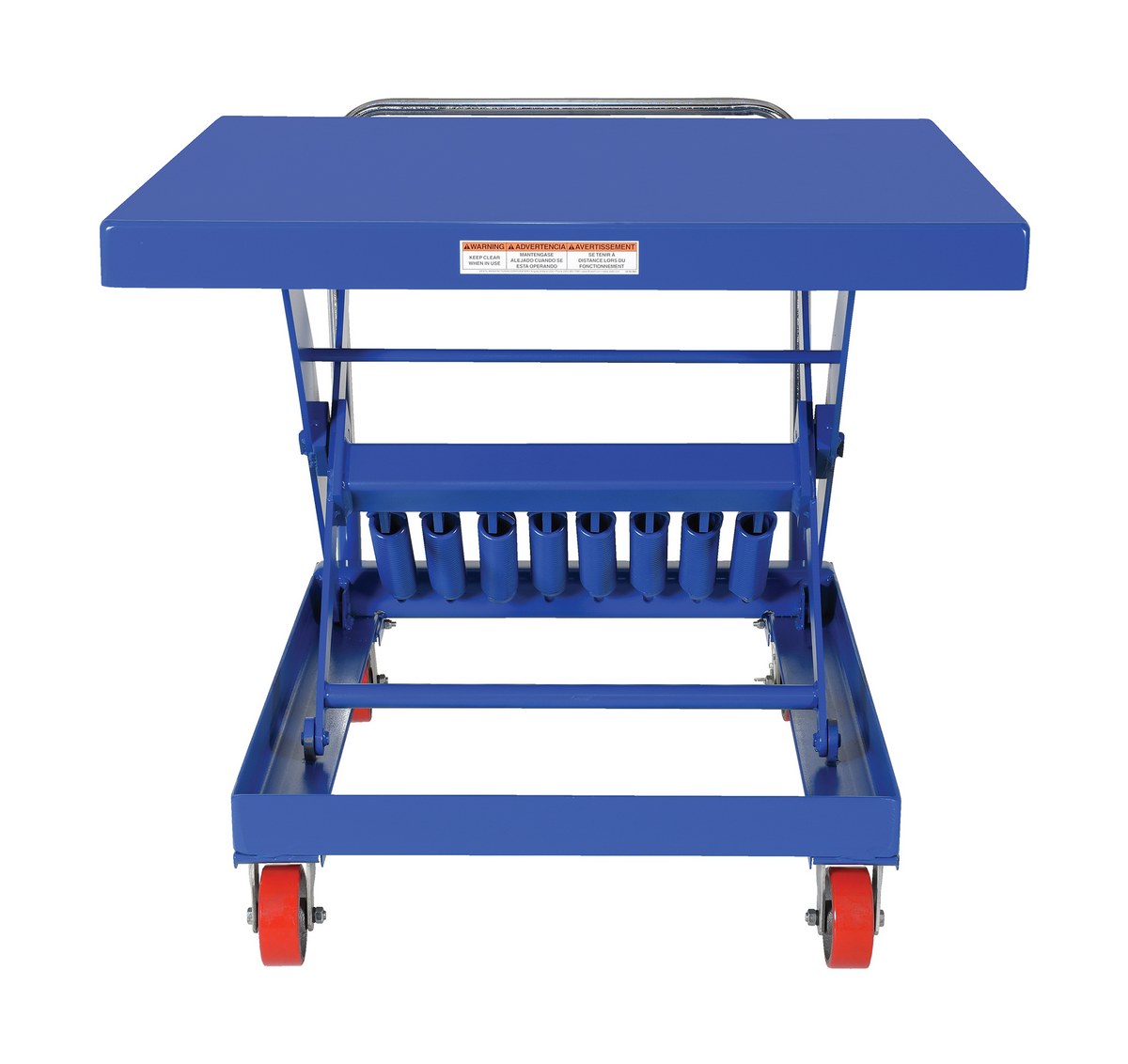 Steel Auto Hite Cart 48-3/16 In. x 42 In. x 37-5/8 In. 2,000 Lb. Capacity BlueThe auto-Hite cart raises and lowers as materials are removed or added to the platform, keeping material at an ergonomic work height. It increases efficiency while reducing potentially harmful bending and twisting motions. Carts utilize tension springs which can be adjusted in order to fit each particular application. The unit has an all steel construction with a removable handle and rolls smoothly on polyurethane casters, two (2) rigid, and two (2) swivel with brake.