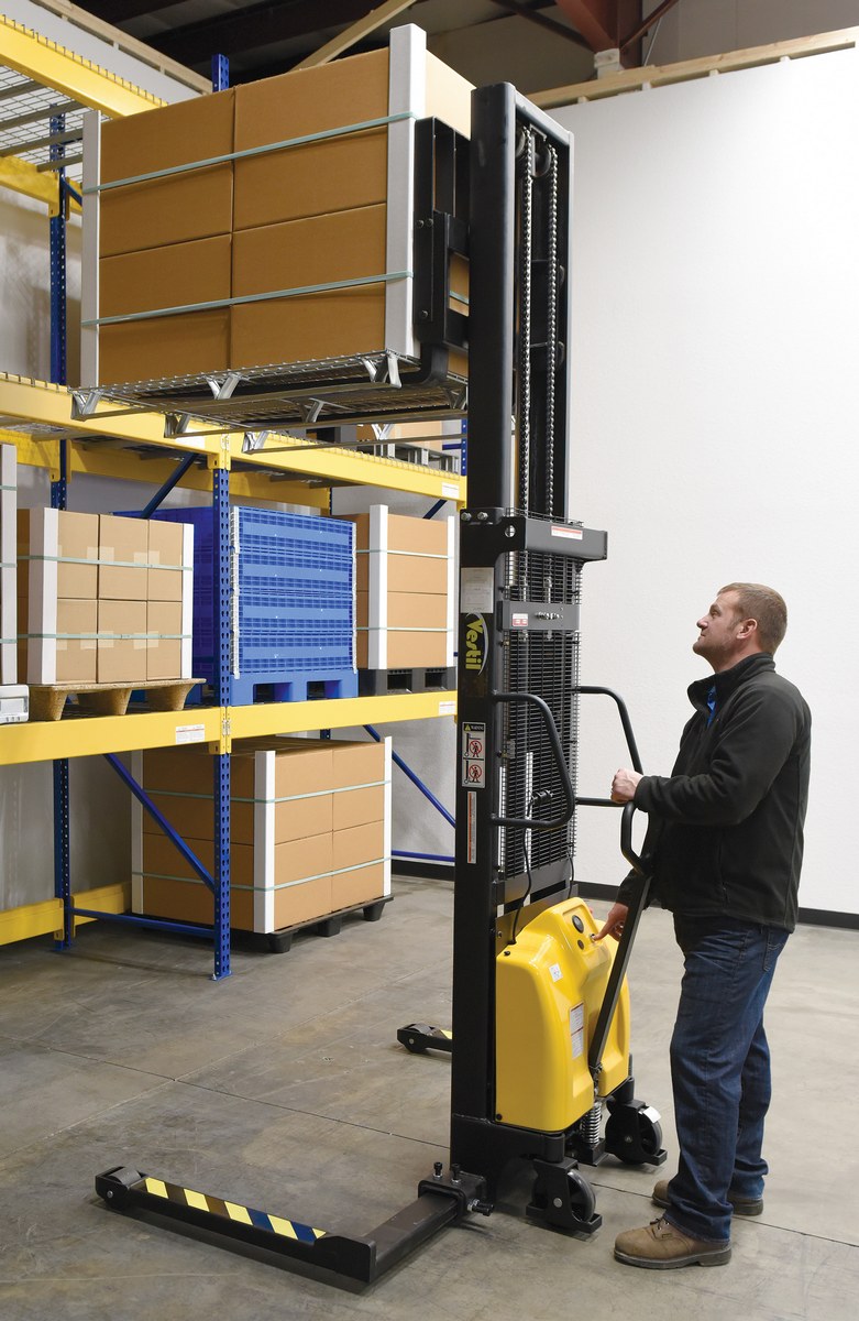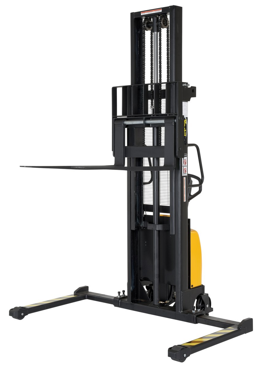 Steel/Plastic Hand Pump DC Powered Stacker with Adjustable Forks and Legs 118 In. Raised Height 2,000 Lb. Capacity Black / Yellow