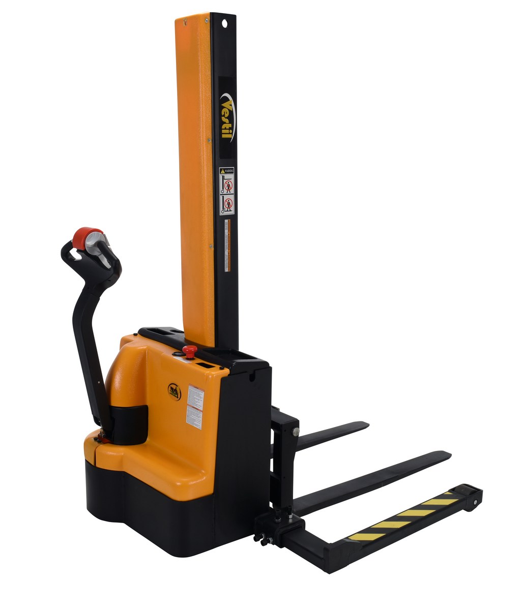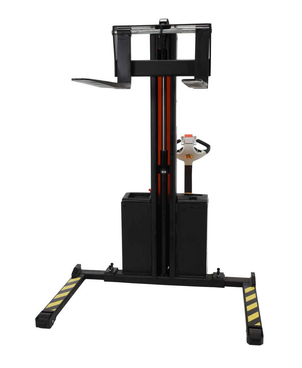 Steel Narrow Mast Stacker DC Powered 62 In. Raised Height Adjustable Forks and Support Legs 1,500 Lb. Capacity Black / Yellow