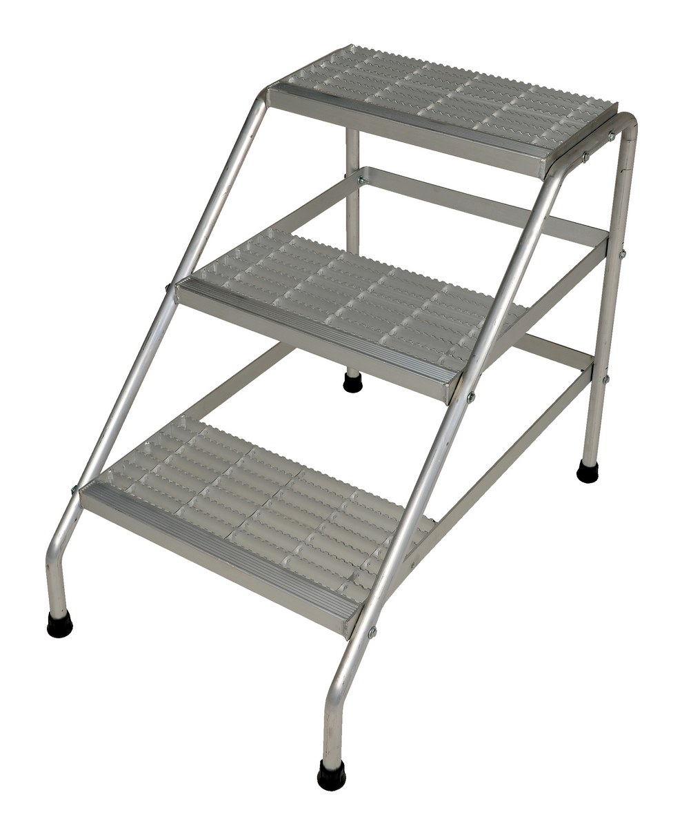 This Aluminum step stand is ideal for industrial or commercial applications. It is lighter than comparable steel models. Open step design includes extra heavy duty serrated surface for traction. With rubber tipped legs, this step ladder is ideal for use on many types floors.