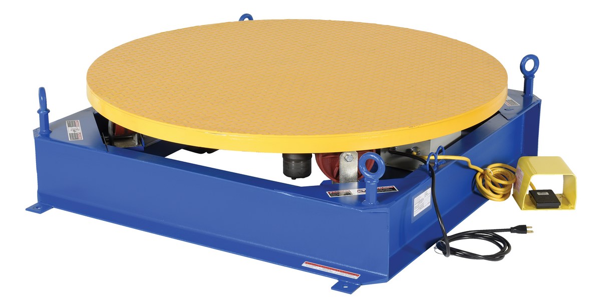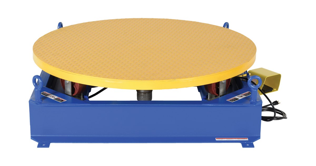 The stand alone powered carousel easily rotates pallets, skids, and other large objects with this rugged powered carousel. This carousel includes a round tread plate turntable that is supported with inverted casters for use as bearings. Also included; turntable, base, power unit, and fixed-speed control. Unit has a heavy-duty steel construction.