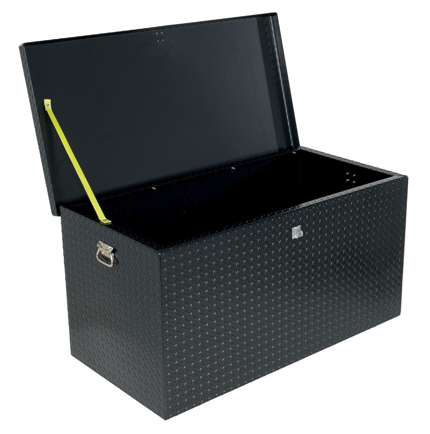 Secure your tools and belongings with a steel tread plate storage box. With a steel construction, outside damage to stored objects is minimized. A centrally located hinged safety hasp makes it simple to secure the box with a padlock (padlock is not included). A handle is attached to each end of the box for easier lifting and maneuvering. Powder coat finish for baked in added toughness.