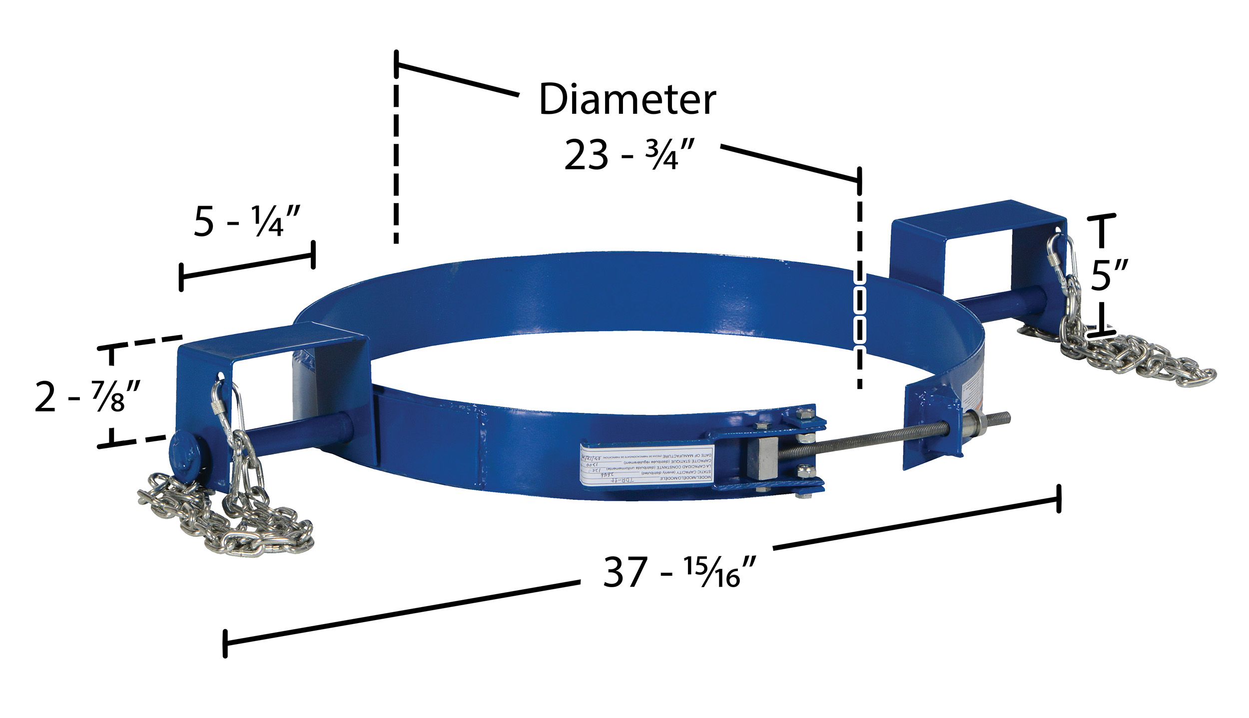 Easily transport steel drums with your fork truck and the tilting drum ring. Pivoting fork pockets allow you to manually rotate drum to dispense light materials. To use, slip the band over the belly of the steel drum and tighten the lock to secure the band around the belly of the drum. Welded steel construction.