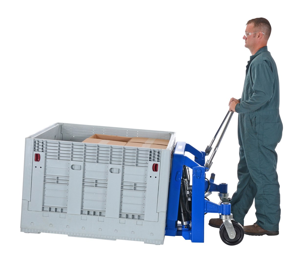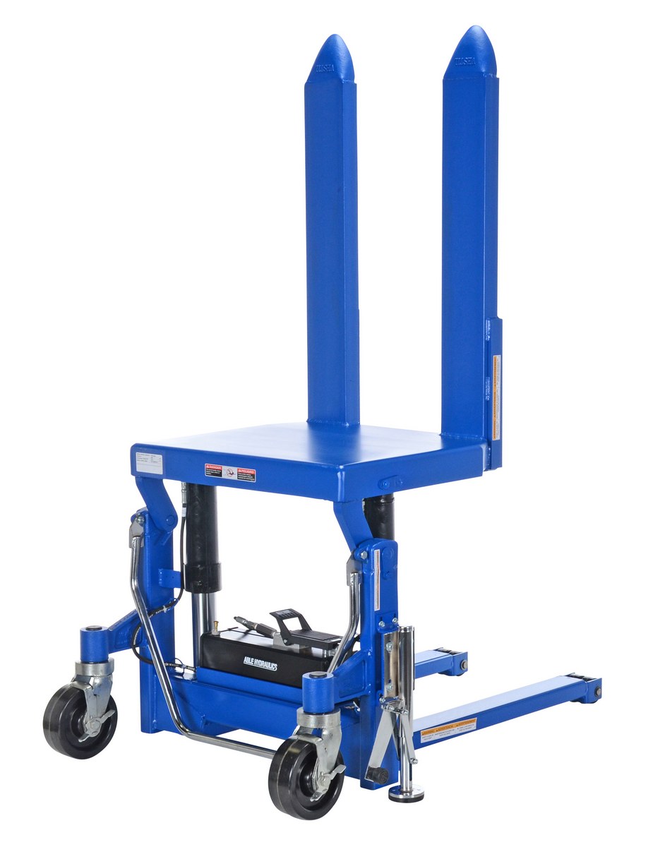The tilt master lifts and positions filled tote boxes or baskets without the need of a fork truck or lift table using the newly designed heavy-duty tilt master. The tilter will function as transporters by moving completed products from work station to work station without waiting for a fork truck. The lift has a thin profile to allow the user to get as close to the load as possible, a standard floor lock and rolls easily on the phenolic steering wheels. It is designed to be used with open bottom pallets or skids. The unit is powered by an air pneumatic motor.