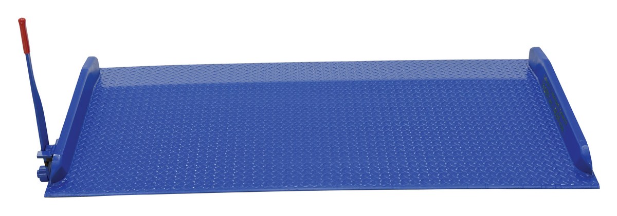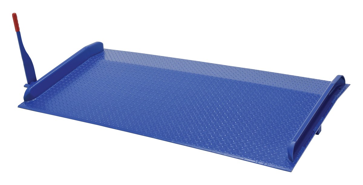 Steel Truck Dock Board 72 In. x 36 In. 10,000 Lb. Capacity BlueThe steel truck dock board is constructed of high strength (55,000 psi) steel for long life. Deck is diamond plated for safe, efficient use. Locking legs minimize ramp movement and are uneven to allow the dock board to sit canted for easier floor pickup by fork trucks when not in use. Standard with lever lift for quick portability with fork truck. Legs are located 12" from the edge of the dock board. Manufactured in compliance with OSHA. Optional accessories: lifting chains, span locks, span pins/holes and removable pickup loops.