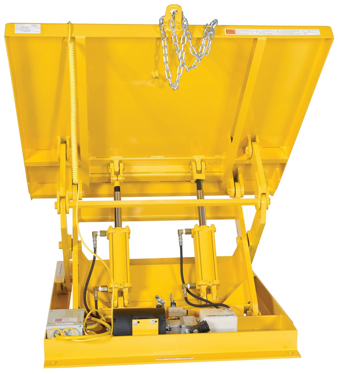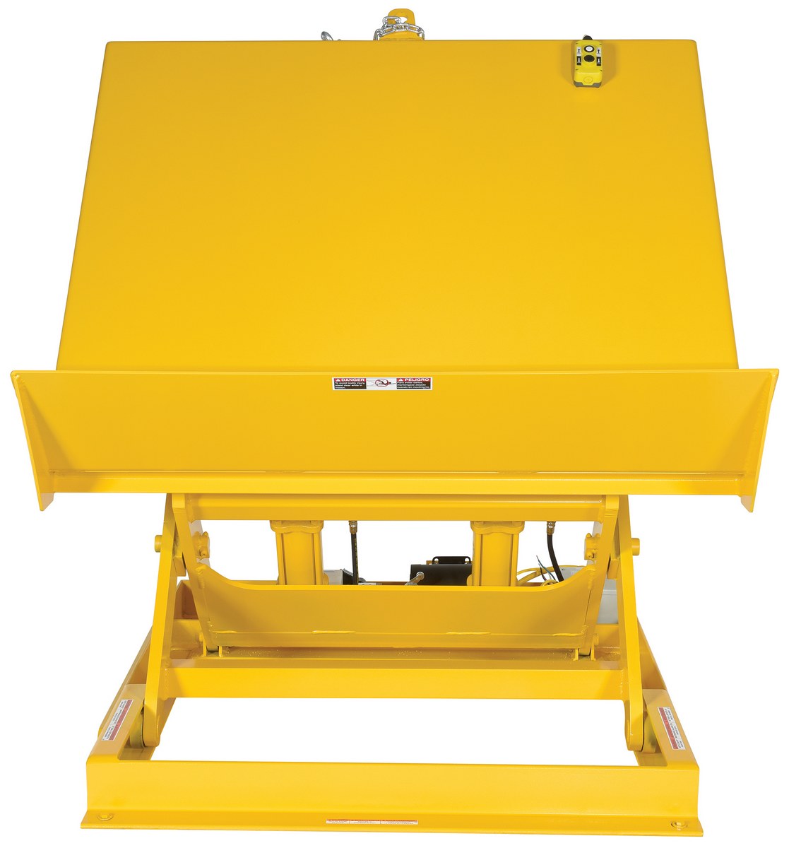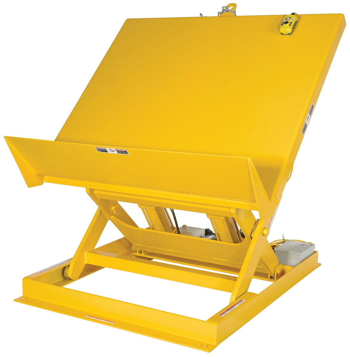 Steel Ergonomic Lift/Tilt Table 54 In. x 48 In. 460 Volt 3 Phase 6,000 Lb. Capacity YellowThe lift & tilt workstation table allows platform to lift & tilt at the same time for easy operation. The platform end includes a high full width lip to support containers. The internal power unit includes electric motor, hydraulic pump, and control box. It includes a two-button hand held pendent control with optional voltages available. The welded steel construction has a yellow painted finish.