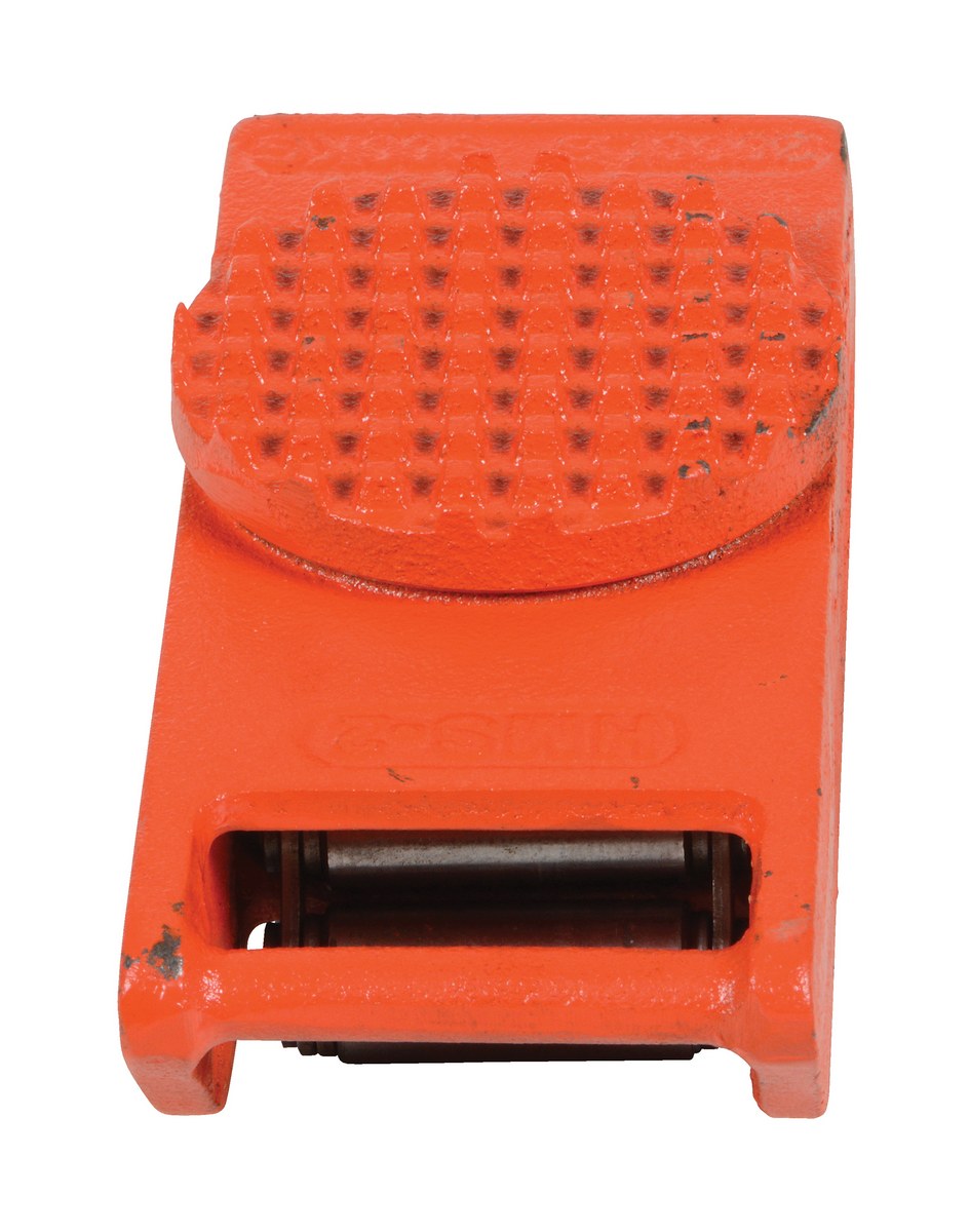 Made of high-strength annealed ductile iron, this steel machine roller has swivel tops that rotate three hundred sixty degrees (360 degrees) on chrome steel ball bearings to allow for easier turning. The rollers form a "tank track" to revolve around a center load bearing plate in the frame to provide maximum maneuverability. The weight of the load is transferred directly from the load bearing plate to the rollers, eliminating axle friction and requiring less power to start and move. A spring loaded locking mechanism on the swivel tops can be engaged in detents at forty-five degrees (45 degrees) intervals. This unit is virtually maintenance free. Steering bars split in two (2) and connect with sleeve for easy storage.