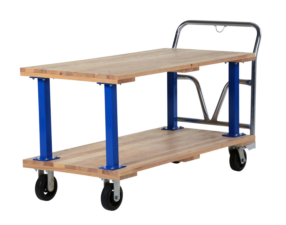 Minimize lifting and bending with this double decker Hardwood platform cart/portable work bench. Ideal for shipping areas, offices, and plant use, these economical carts are perfect for many of your applications. Removable push handle is chrome plated. Countersunk holes allow for a smooth deck surface.