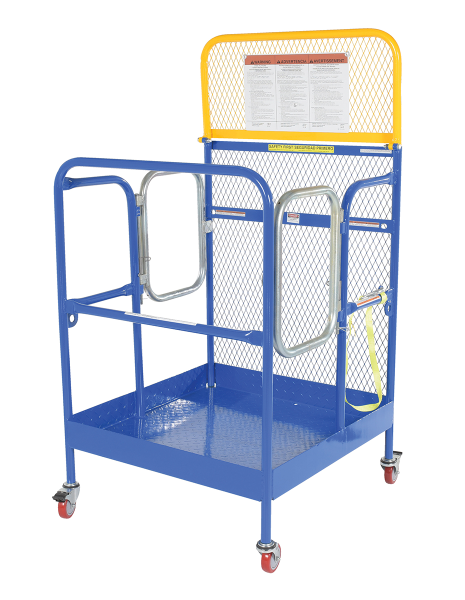 Steel Work Platform With 2 Door Entry and Poly Casters 36 In. x 36 In. 1,000 Lb. Capacity BlueThis convenient fork truck work platform quickly and safely raises maintenance personnel where they are needed. Attaches to fork truck by inserting forks into fork pockets and securing platform to fork truck. Fork locks secure platform to forks. Dual handrails on three (3) sides with expanded metal backing on the fourth side. Includes checker floor plate platform and long strap with hook to attach platform to fork truck. A maximum of two (2) people can be in the work platform at one time.
