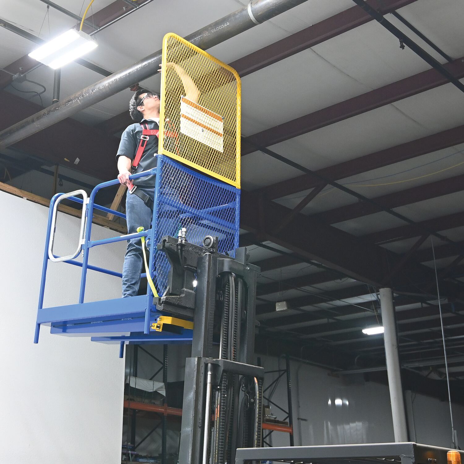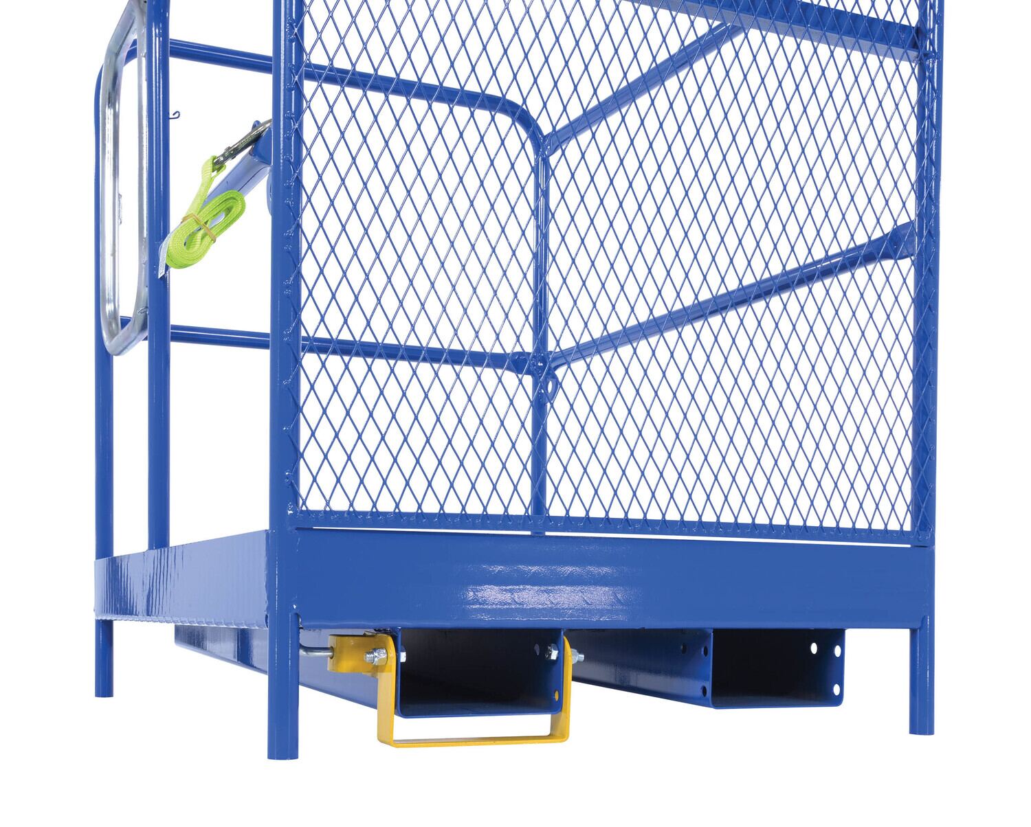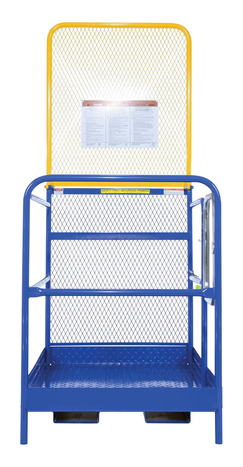 Steel Work Platform With 84 In. Expanded Back 36 In. x 48 In. 1,000 Lb. Capacity BlueThis convenient fork truck work platform quickly and safely raises maintenance personnel where they are needed. Attaches to fork truck by inserting forks into fork pockets and securing platform to fork truck. Fork locks secure platform to forks. Dual handrails on three (3) sides with expanded metal backing on the fourth side. Includes checker floor plate platform and long strap with hook to attach platform to fork truck. A maximum of two (2) people can be in the work platform at one time. Meets California OSHA specifications.