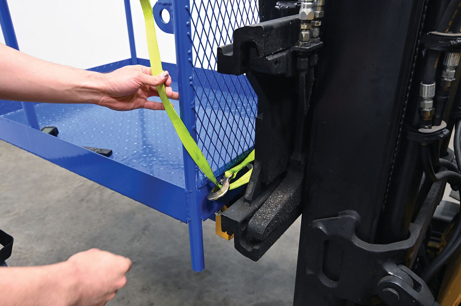This convenient fork truck work platform quickly and safely raises maintenance personnel where they are needed. Attaches to fork truck by inserting forks into fork pockets and securing platform to fork truck. Fork locks secure platform to forks. Dual handrails on three (3) sides with expanded metal backing on the fourth side. Includes checker floor plate platform and long strap with hook to attach platform to fork truck. A maximum of two (2) people can be in the work platform at one time. Meets California OSHA specifications.