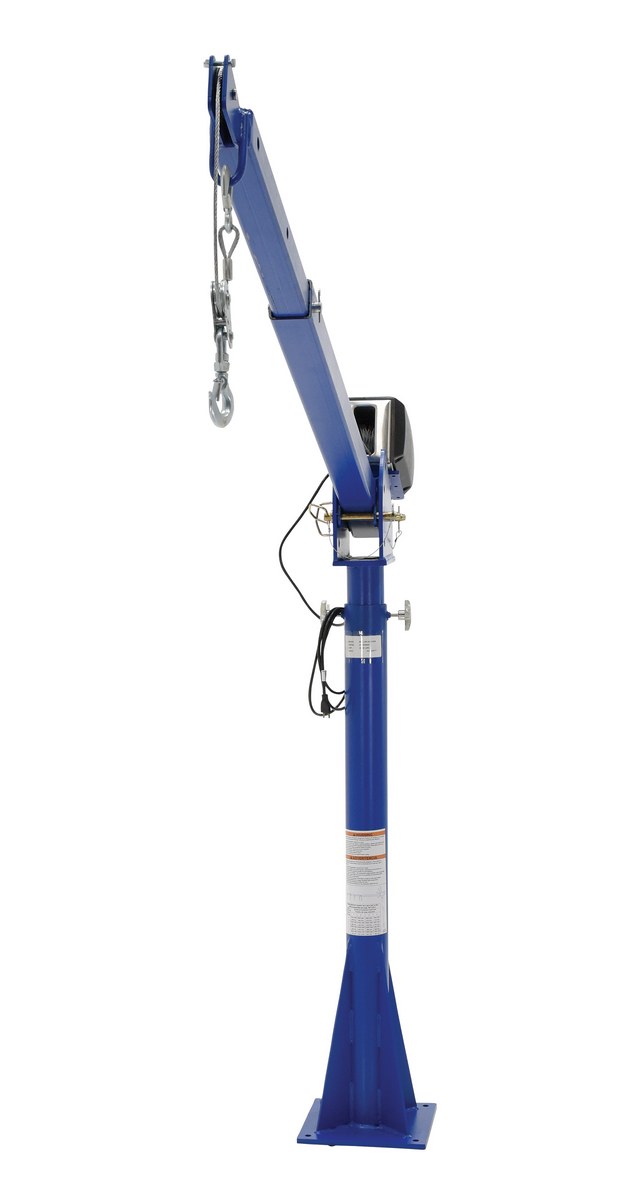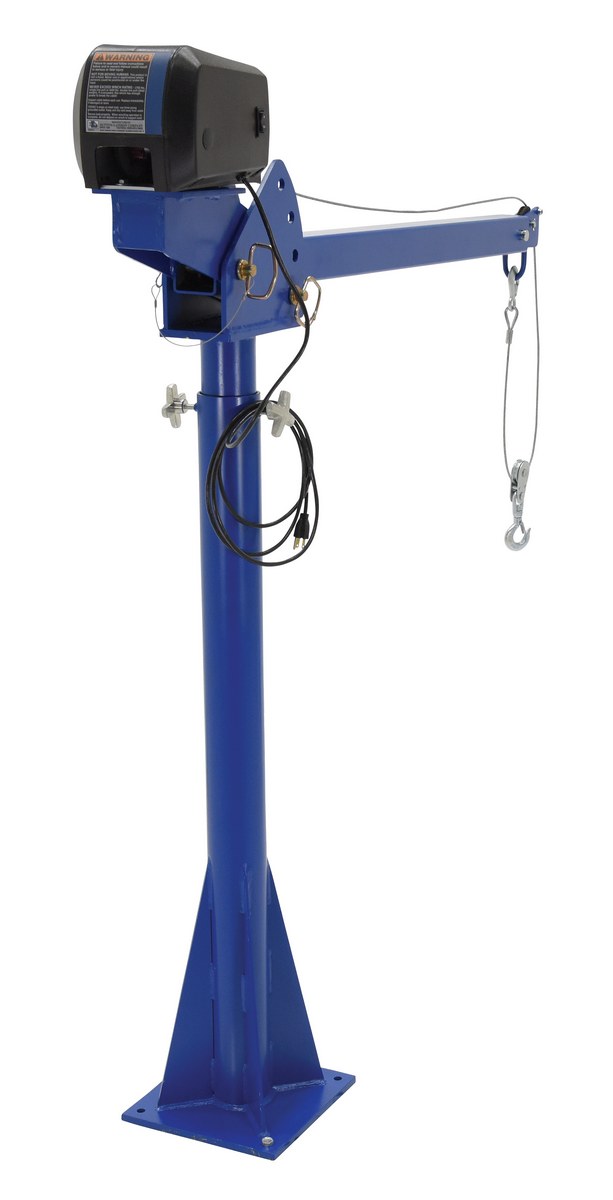 A power lift Jib crane is designed for material handling applications on docks, in warehouses or in truck beds. This intermittent unit uses crane feature rotation hand brakes that offer unlimited positioning. The mast mounts permanently. Boom adjusts in one (1) foot increments and can be positioned at four (4) elevations. Fingertip switch to raise and lower hook. Folds for storage. Unit is designed for vertical lifting only. Do not use unit for lifting personnel or overhead lifting.